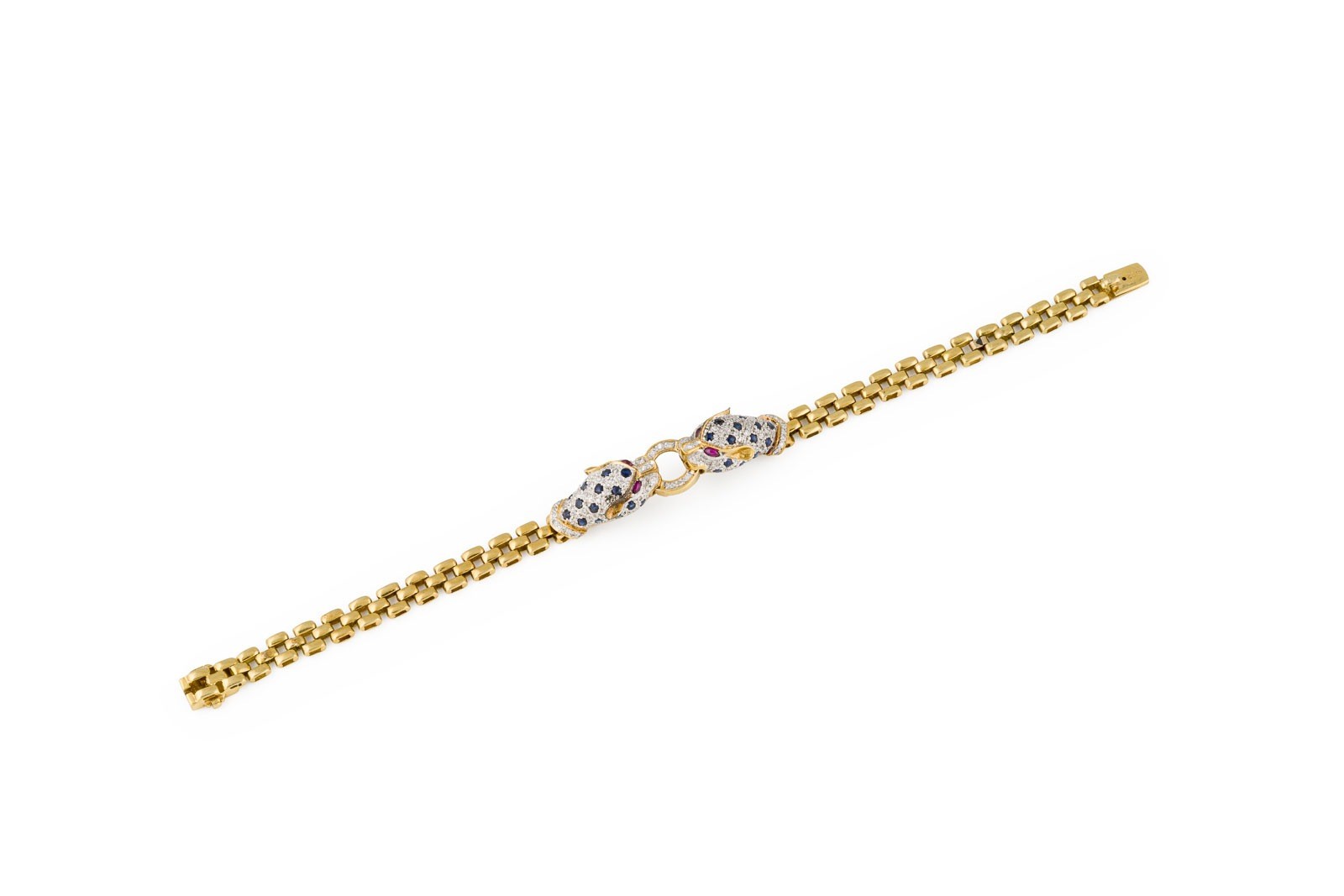 GG 750. Maße: L.: ca. 19,0 cm. B.: ca. 6,3 mm. Ges.-Gew.: ca. 19,4 g. Armband mit zwei Pantherköpfen, besetzt mit Diamanten zus. ca. 0.50 ct. und Saphiren zus.