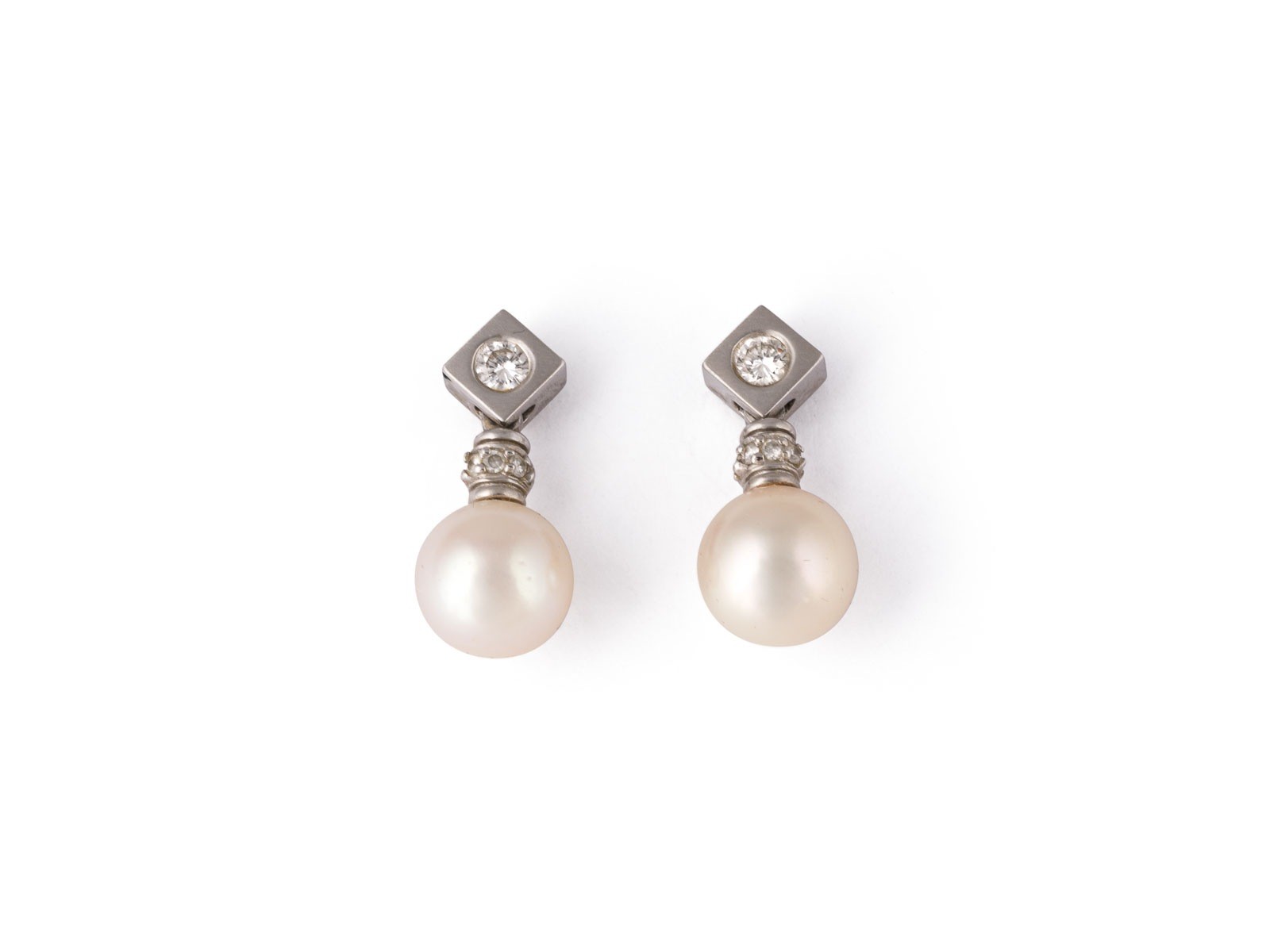 WG 585. Maße: L.: ca. 19,5 mm, D.(Perle): ca. 8,5 mm. Ges.-Gew.: ca. 5,0 g. Perlen Ohrhänger, besetzt mit jeweils einem Brillanten von ca. á 0.10 ct. H/VS-SI.