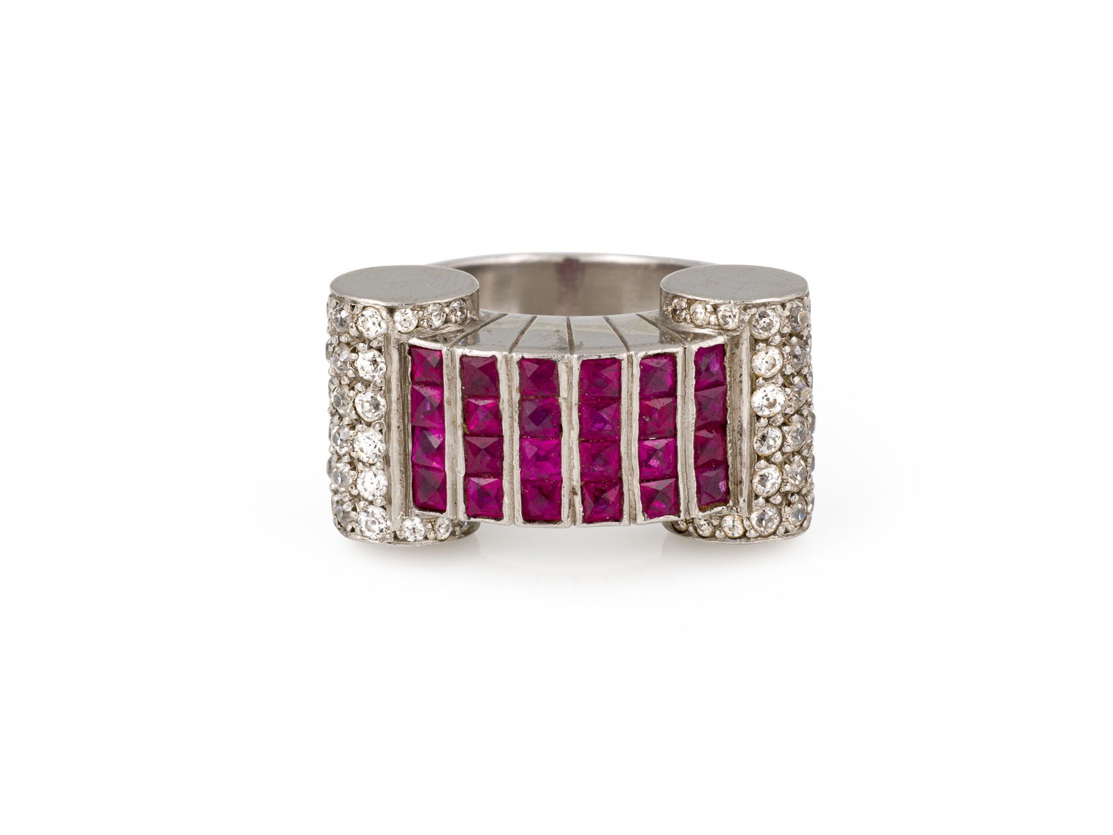 WG 750 (getestet). Ringmaß: ca. 54,5. Ringkopfmaße: ca. 13,1 x 25,1 m. Ges.-Gew.: ca. 13,3 g. Ring, besetzt mit Diamanten im Altschliff zus. ca. 1.50 ct., sowie Rubinen zus. ca. 1.20