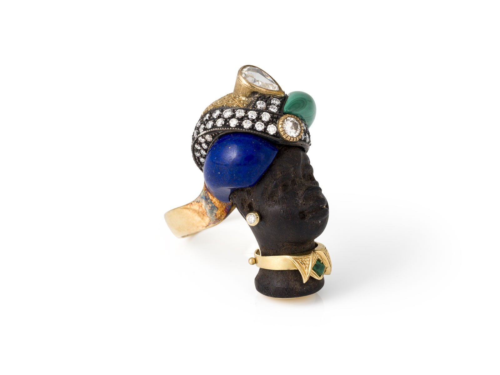 Menschenkopfs mit prächtigem Kopfschmuck, besetzt mit einer tropfenförmigen Diamantrose