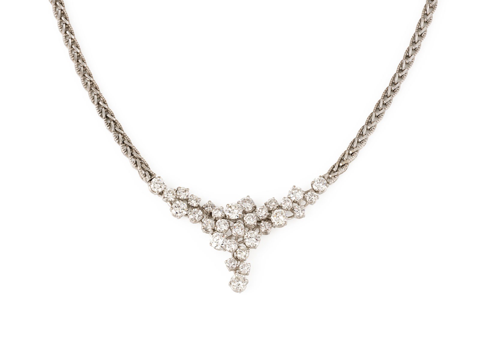 WG 585. L.: ca. 37,5 cm. Ges.-Gew.: ca. 23,3 g. Collier, reichlich besetzt mit Brillanten zus. ca. 4.50-5.00 ct. F-G/VVS-P.