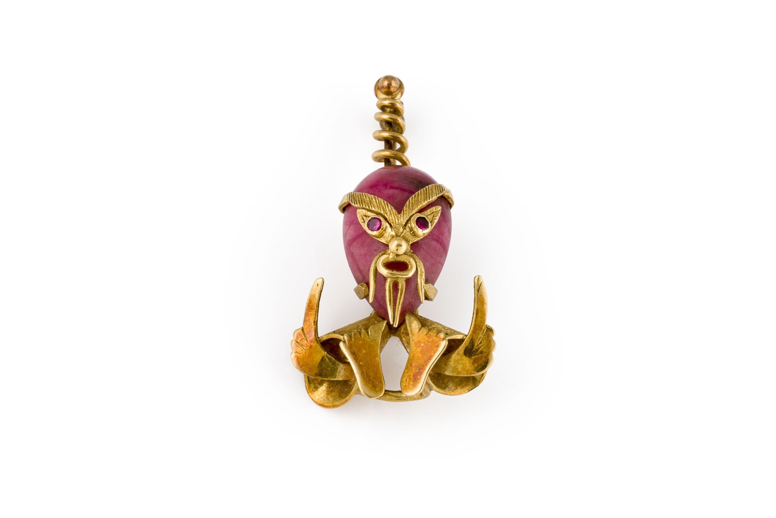 GG 750 (getestet). Maße: ca. 41,0 x 22,8 mm. Ges.-Gew.: ca. 9,2 g. Brosche mit der Darstellung einer männlichen Gestalt mit einem Kopf aus wohl Rhodonit.