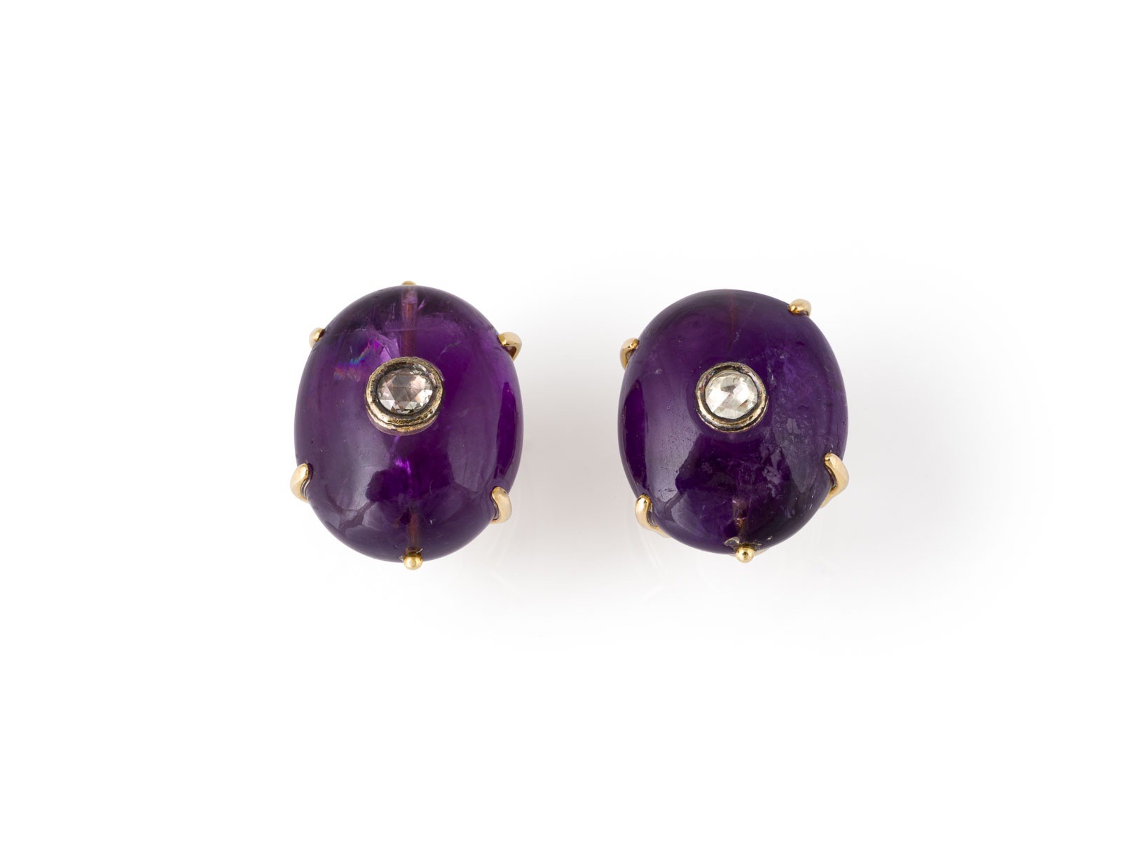 GG 750. Maße: ca. 25,2 mm x 18,9 mm. Ges.-Gew.: ca. 27,1 g. Ohrclipstecker, besetzt mit jeweils einem sehr großen Amethyst Cabochon á ca. 40.00 ct.,