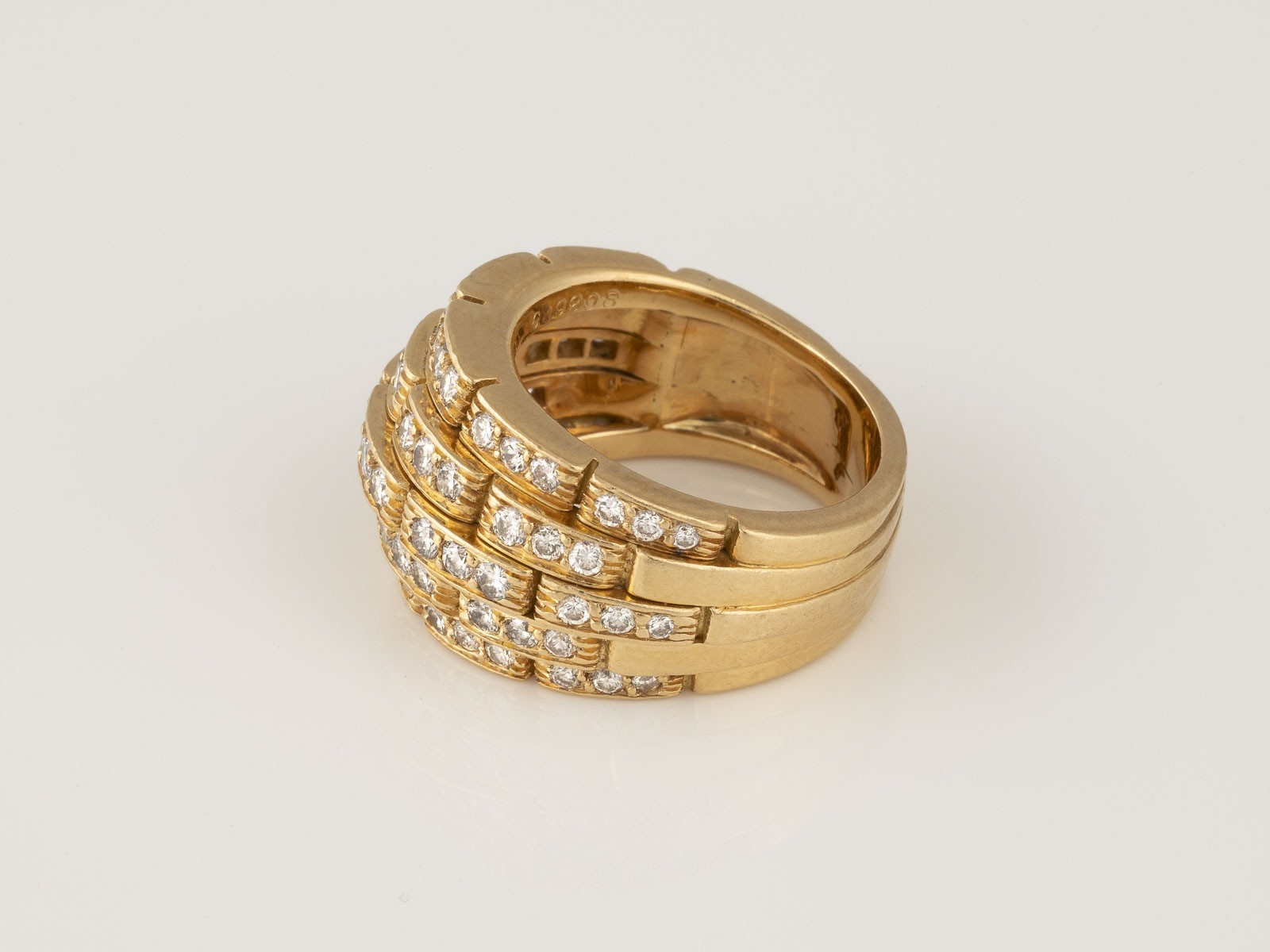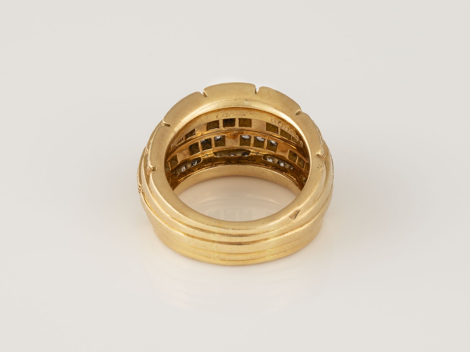 Gelbgold. Ringmaß ca. 51,5, Ges.-Gew. ca. 15,4 g. Gest. 750, beschriftet 'Cartier', nummeriert. 69 Brillanten, zusammen ca. 1,10 ct. Tragespuren.