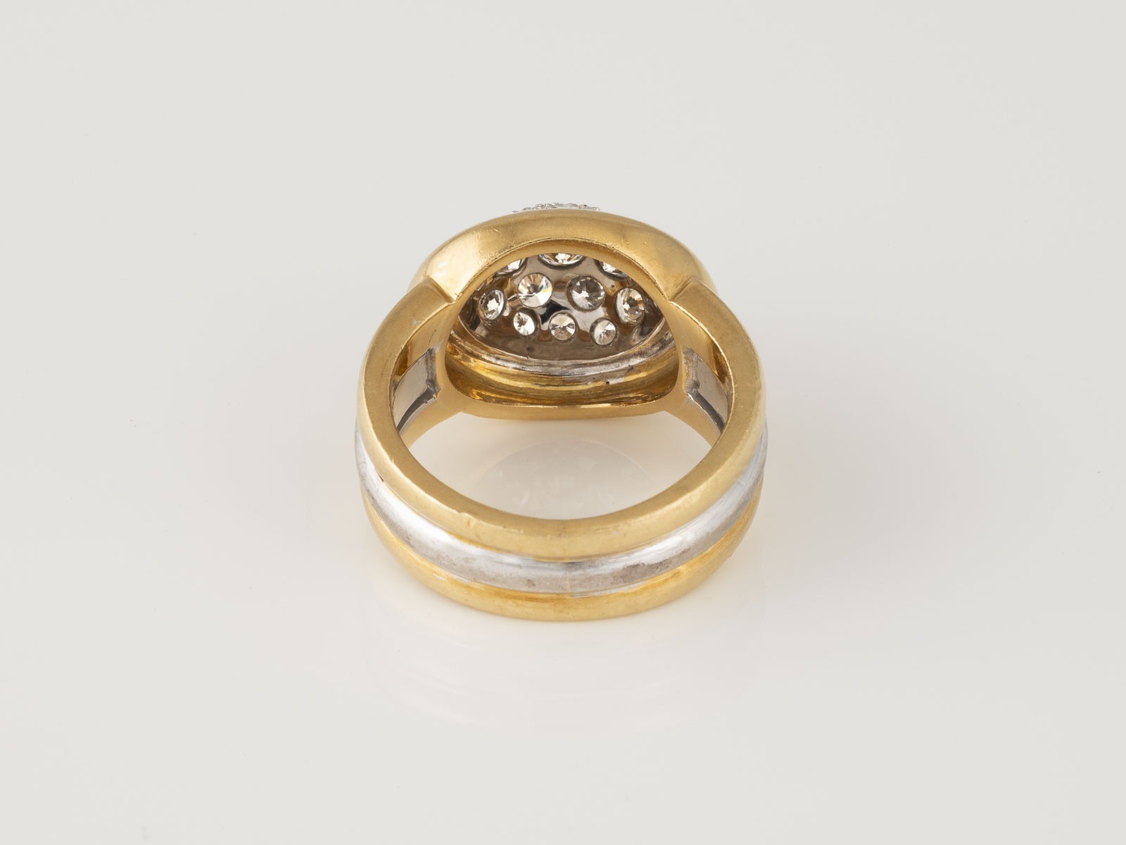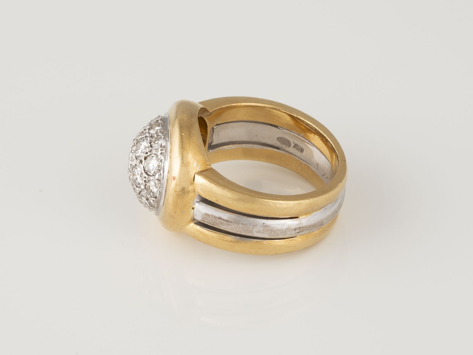 Gelbgold, Weißgold. Ringmaß ca. 52, Ges.-Gew. ca. 12,6 g. Gest. 750, Herstellersignet. 19 Brillanten, zusammen ca. 0,90 ct., etwa Wesselton-Top Crystal (H-I) VVS-SI.