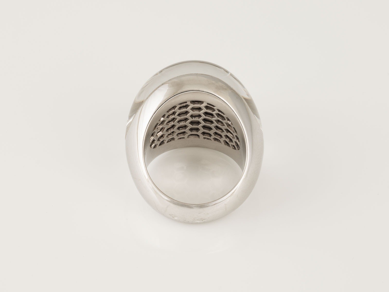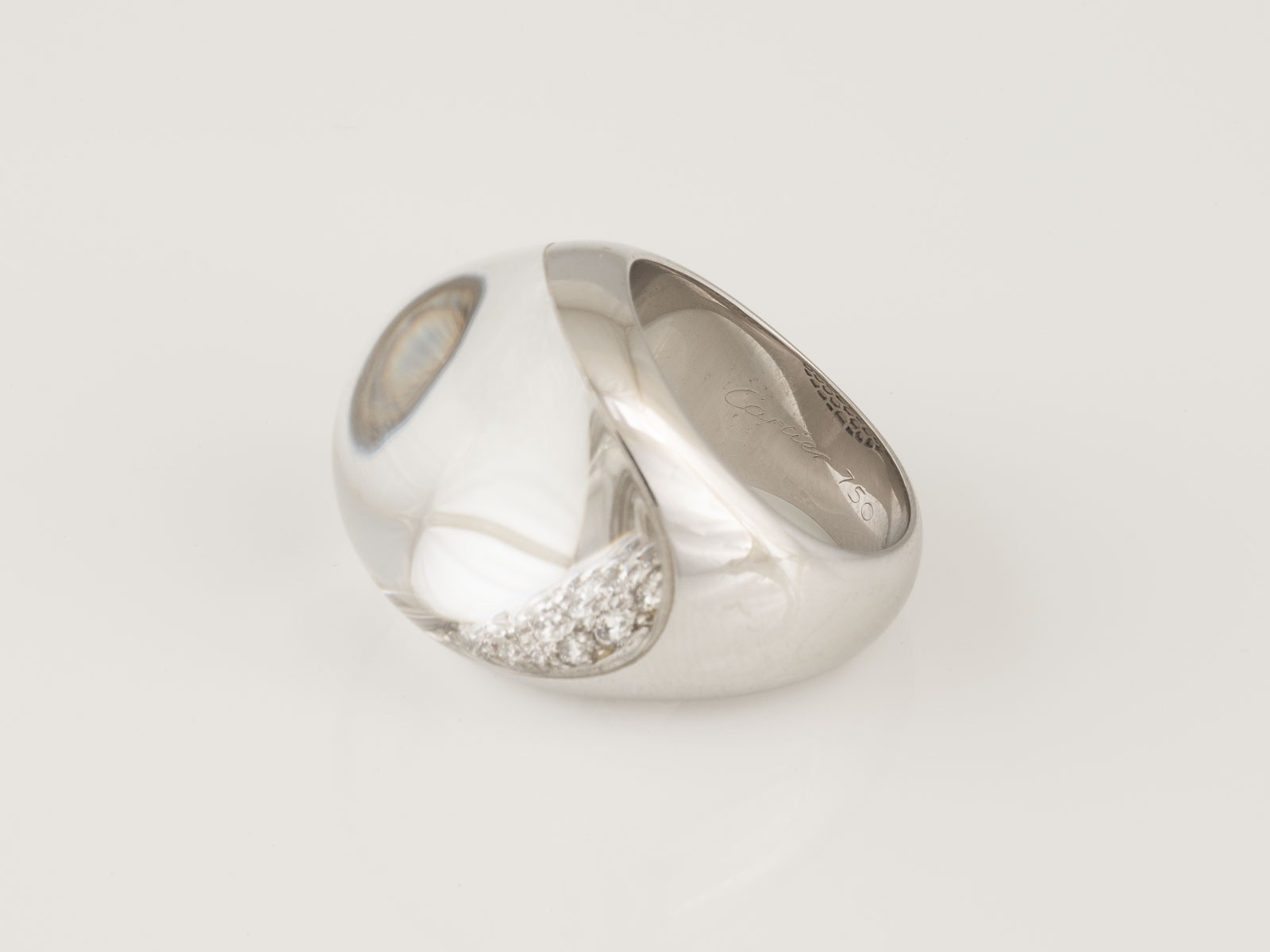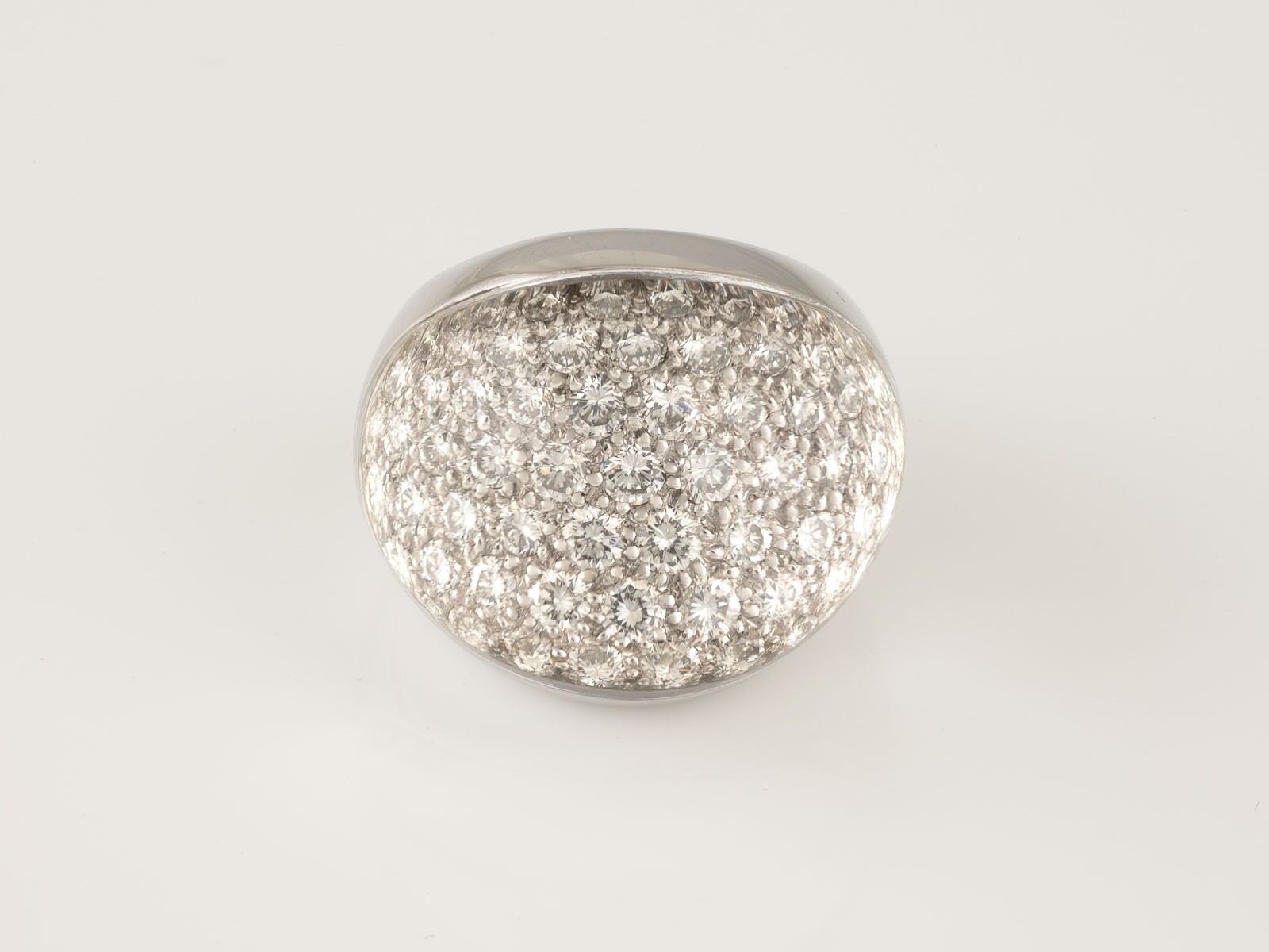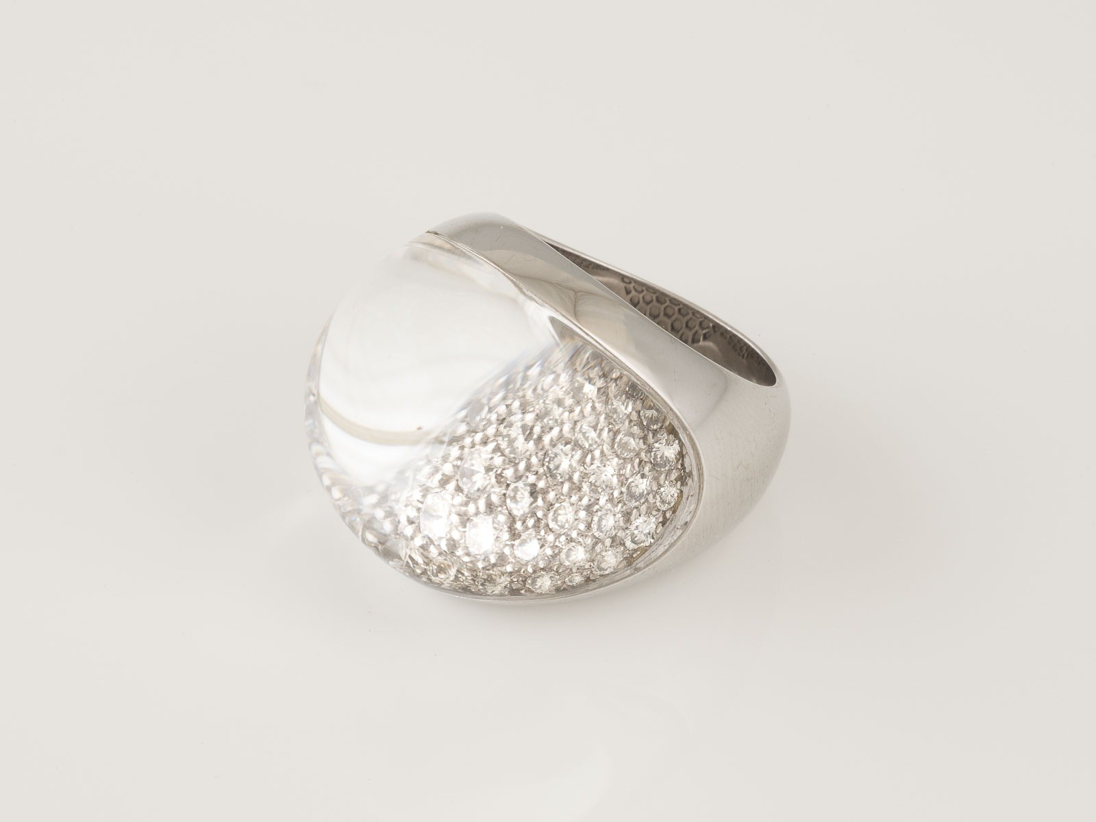 Weißgold. Ringmaß ca. 54, Ges.-Gew. ca. 30,0 g. Gest. 750, Herstellersignet, nummeriert, französische Marke 'Adlerkopf'. Unter einer polierten Bergkristall-Kuppel Brillantbesatz im Pavée. Leichte Tragespuren.