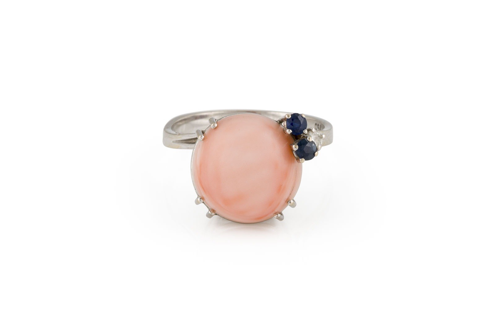WG 750. Ringmaß: ca. 61. Ringkopfmaße: ca. 13,3 x 16,3 x 1. Ges.-Gew.: ca. 3,6 g. Ring, besetzt mit einer Engelshaut-Koralle von ca. 8.20 ct., sowie seitlich zwei kleinen