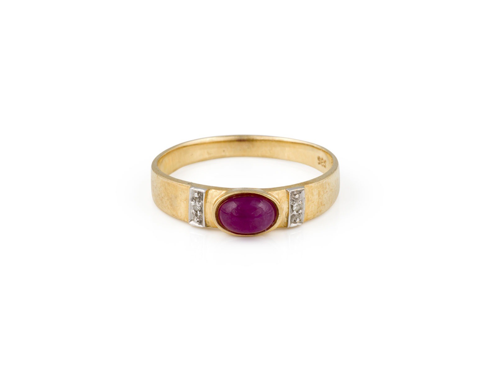 GG 585. Ringmaß: ca. 56,5. Ringbreite: ca. 5,0 mm. Ges.-Gew.: ca. 2,0 g. Bandring, besetzt mit einem zentralen Rubin-Cabochon von ca. 0.70 ct. und zwei kleinen