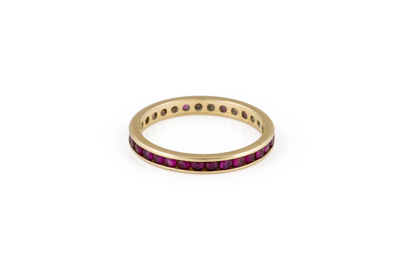 GG 750. Ringmaß: ca. 54. Ringbreite: ca. 2,5 mm. Ges.-Gew.: ca. 1,9 g. Memoirering, besetzt mit wohl Rubinen.