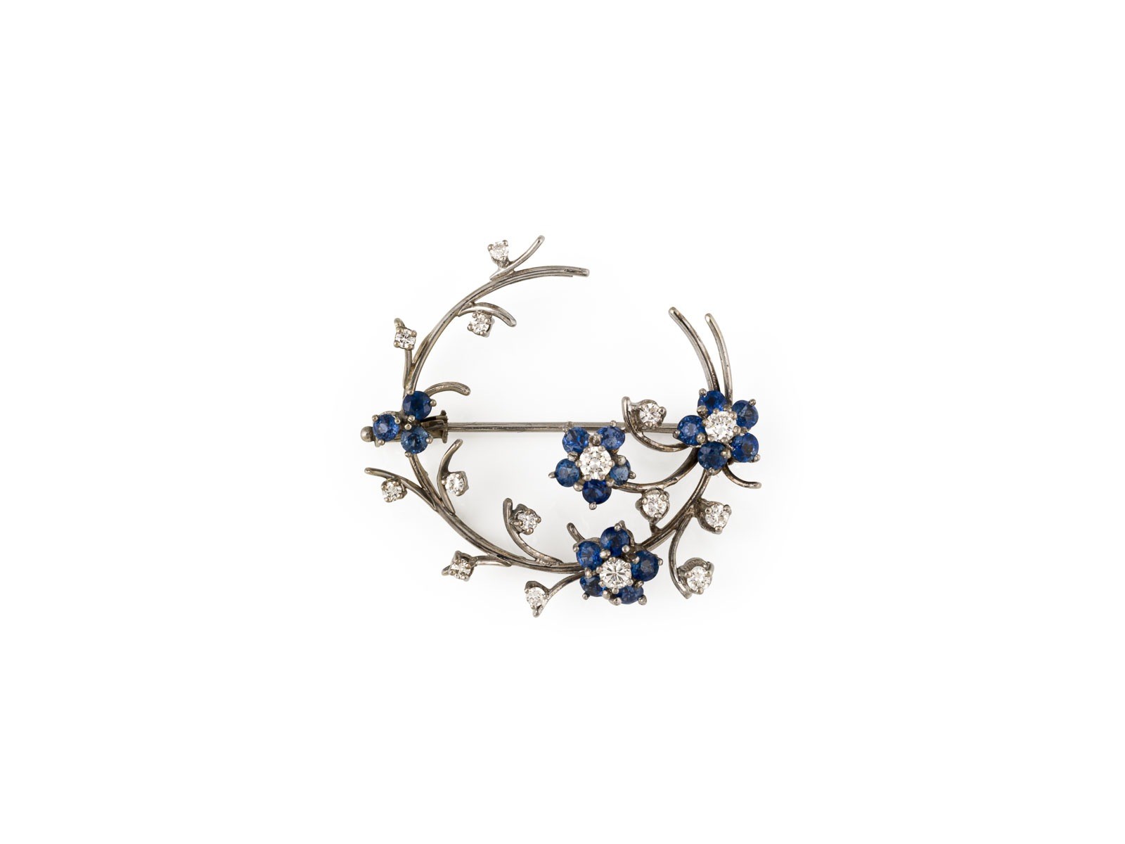 WG 585. Maße: ca. 37,2 mm x 32,8 mm. Ges.-Gew.: ca. 8,2 g. Runde Brosche im Blütenmotiv, besetzt mit blauen Farbsteinen - wohl Saphire, sowie