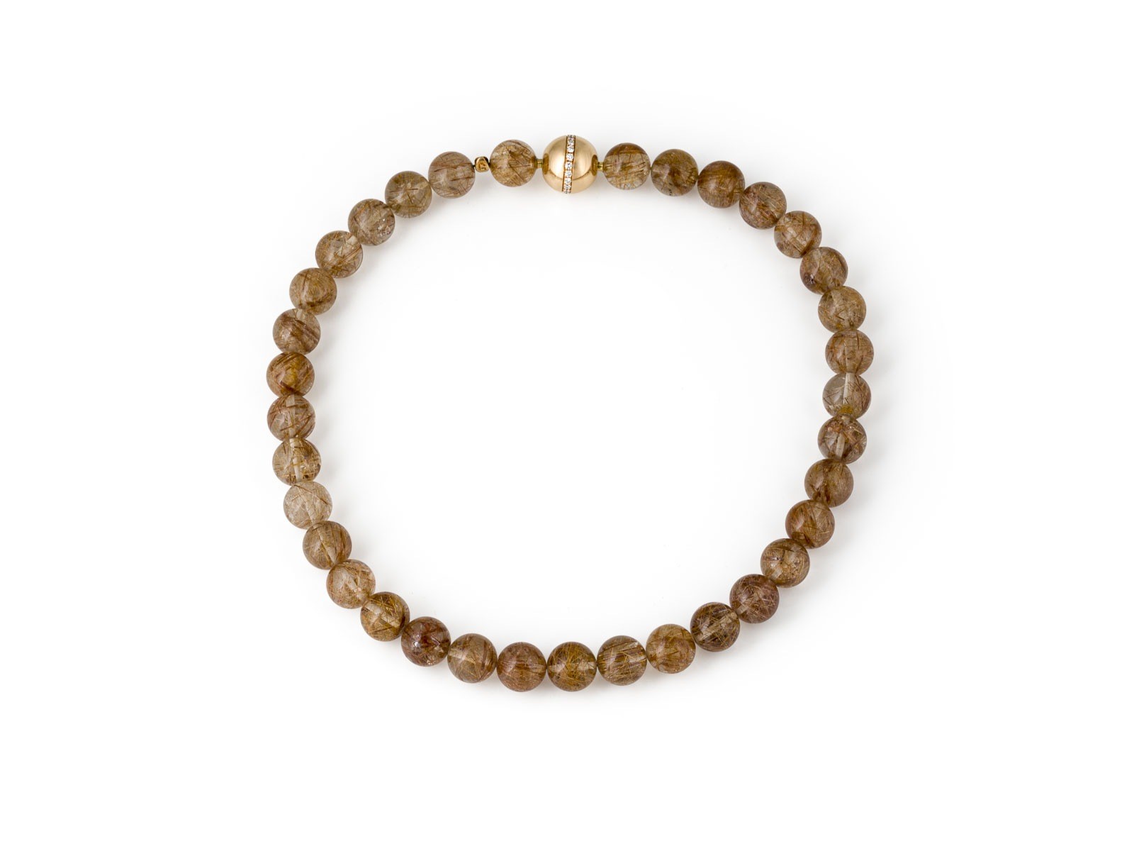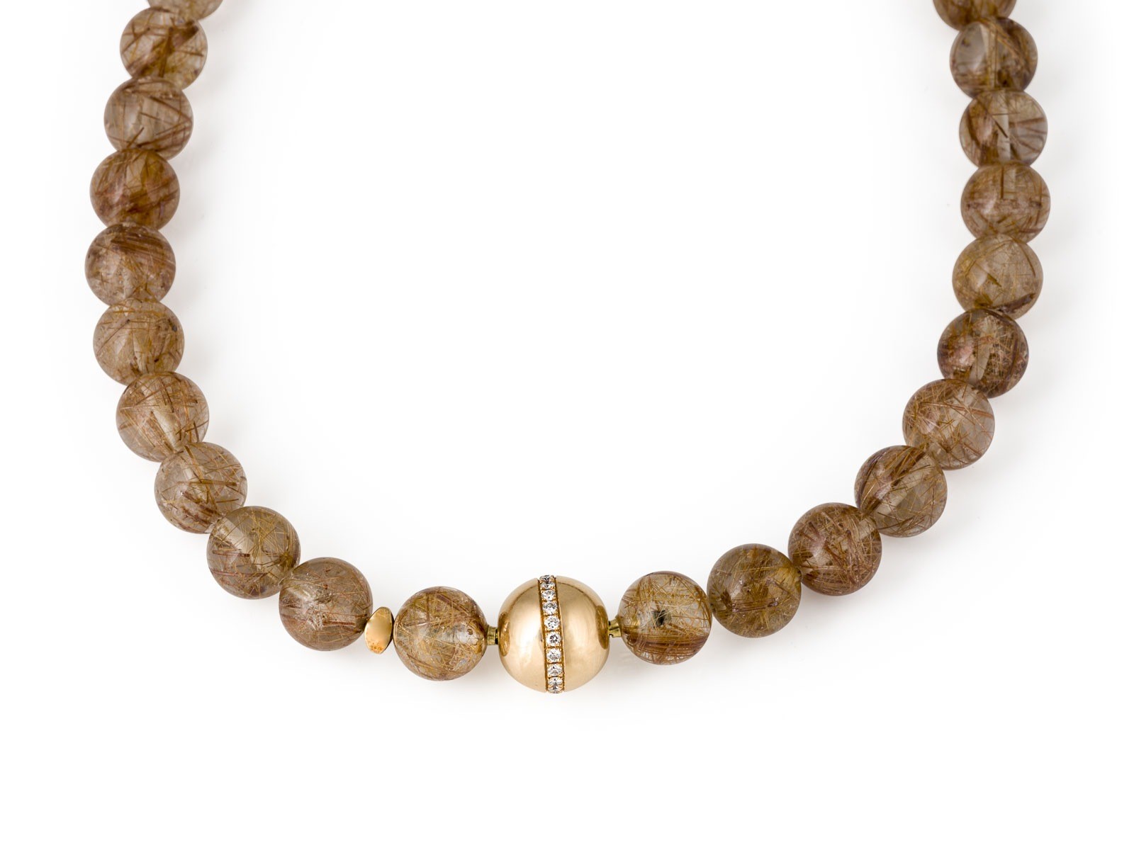 GG 750. Maße: L.: ca. 44,5 cm, D.(Kugeln): ca. 12,1 mm. Ges.-Gew.: ca. 97,2 g. Collier aus Rutilquartz-Kugeln und einem Drehverschluss von Niessing in Kugelform, besetzt