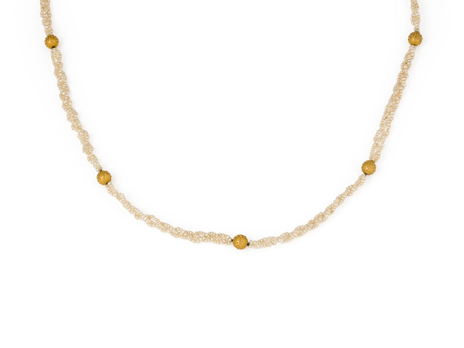 GG 585 (getestet). Maße: L.(Gesamt): ca. 41,0 cm. D.(Goldkugel): ca.. Ges.-Gew.: ca. 7,0 g. Saatperlen Collier. 3-Reihig und geflochten mit Zwischenelementen aus Goldkugeln.