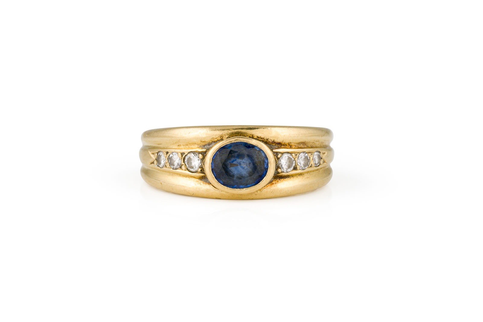 GG 750 (getestet). Ringmaß: ca. 53. Ringbreite: ca. 7,6 mm. Ges.-Gew.: ca. 3,9 g. Ring, besetzt mit einem zentralen Saphir von ca. 0.60 ct., sowie Brillanten zus. ca. 0.13