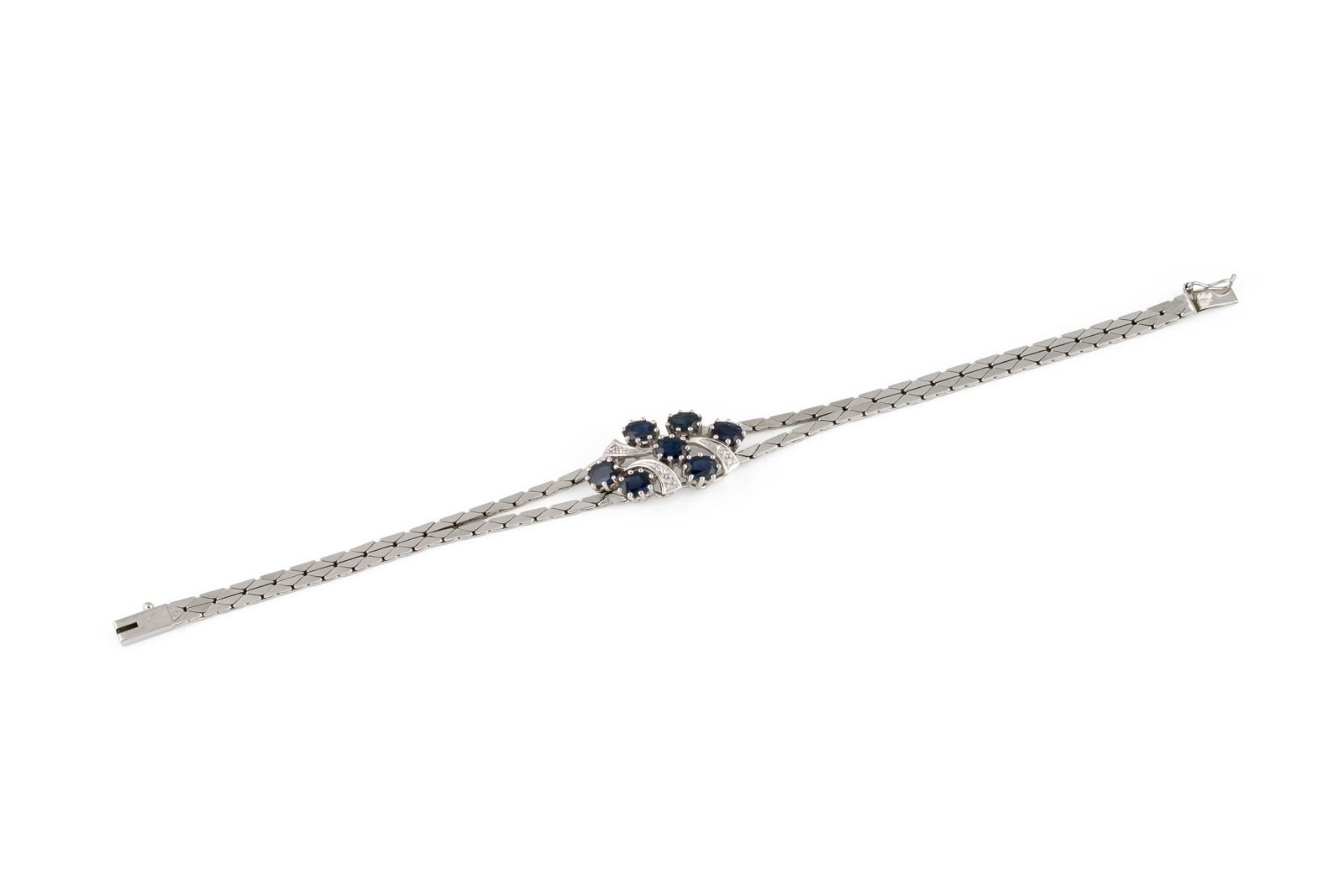 WG 585. L.: ca. 18,0 cm. B.: ca. 13,8 mm. Ges.-Gew.: ca. 12,8 g. Armband, besetzt mit Saphiren zus. ca. 2.10 ct., sowie kleine Diamanten im 8/8-Schliff.