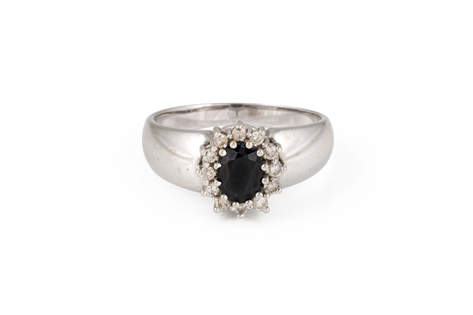 WG 585. Ringmaß: ca. 60,5. Ringkopfmaße: ca. 11,2 x 10,3 m. Ges.-Gew.: ca. 5,9 g. Ring, besetzt mit einem zentralen Saphir von ca. 0.85 ct. und einem Kranz aus Brillanten