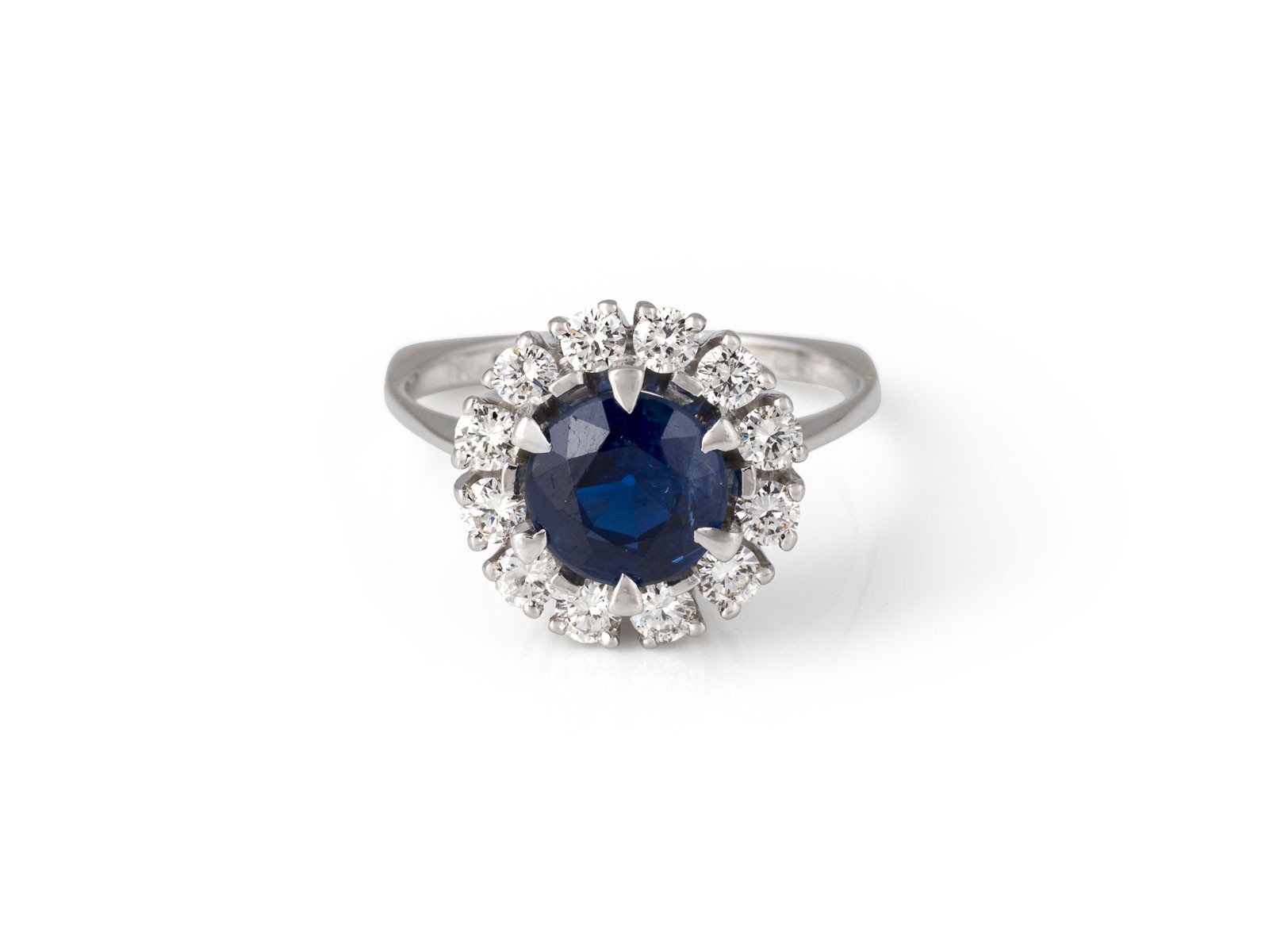 WG 750. Ringmaß: ca. 55. D.(Ringkopf): ca. 13,5 mm. Ges.-Gew.: ca. 5,6 g. Ring mit einem zentralen Saphir von ca. 2.04 ct. und einem Kranz aus Brillanten zus. ca.