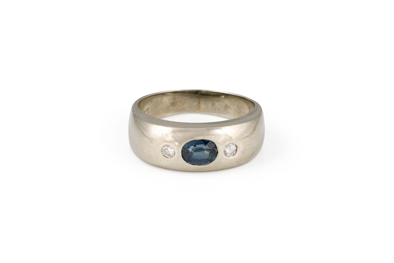 WG 585. Ringmaß: ca. 55. Ringbreite: ca. 7,3 mm. Ges.-Gew.: ca. 5,2 g. Ring, besetzt mit einem zentralen Saphir von ca. 0.70 ct., flankiert von zwei Brillanten