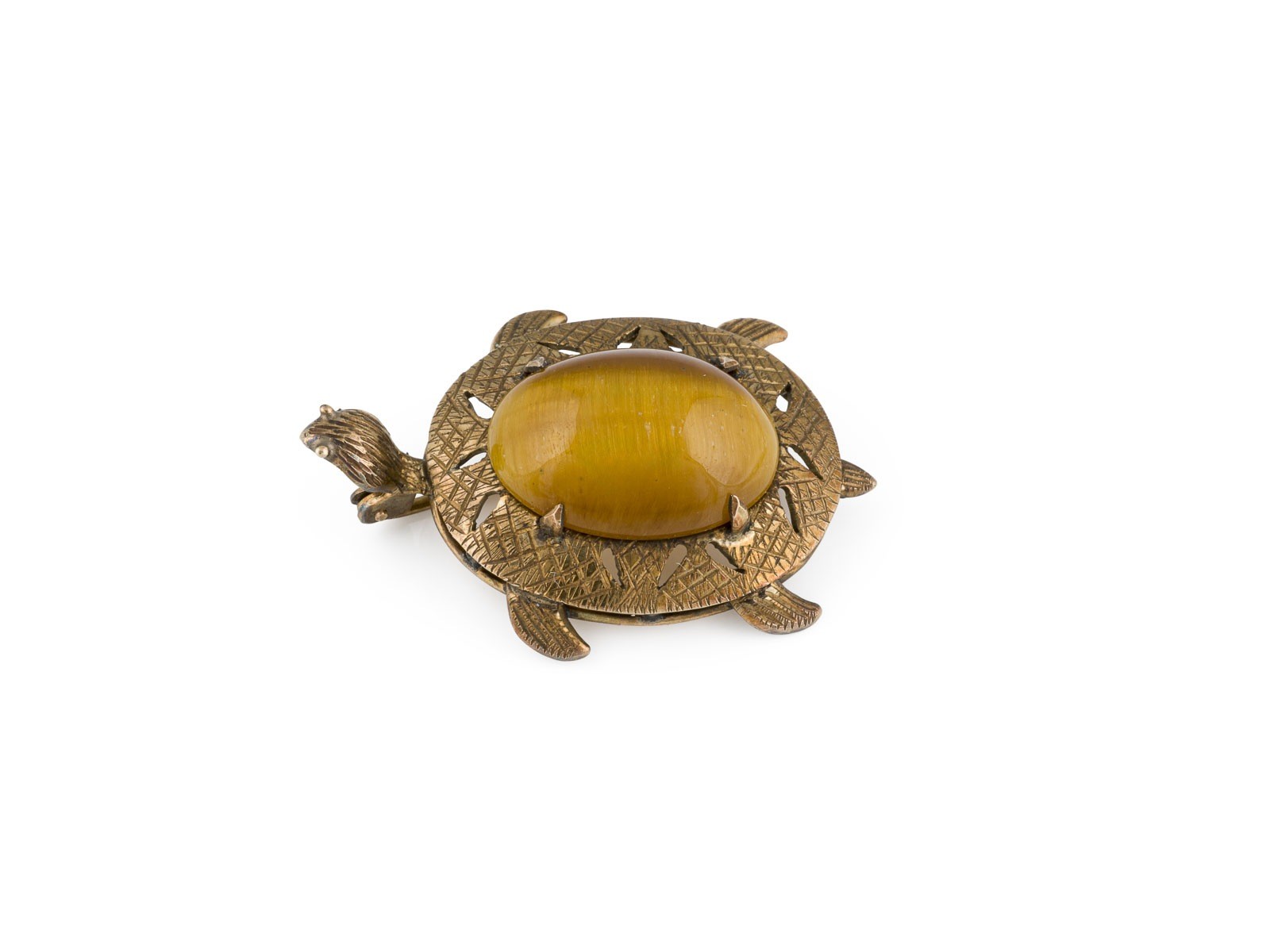 GG 333 (getestet). Maße: ca. 36,3 x 24,3 mm. Ges.-Gew.: ca. 5,2 g. Brosche in Form einer Schildkröte, besetzt mit einem Tigeraugen-Cabochon von ca. 5.50 ct.
