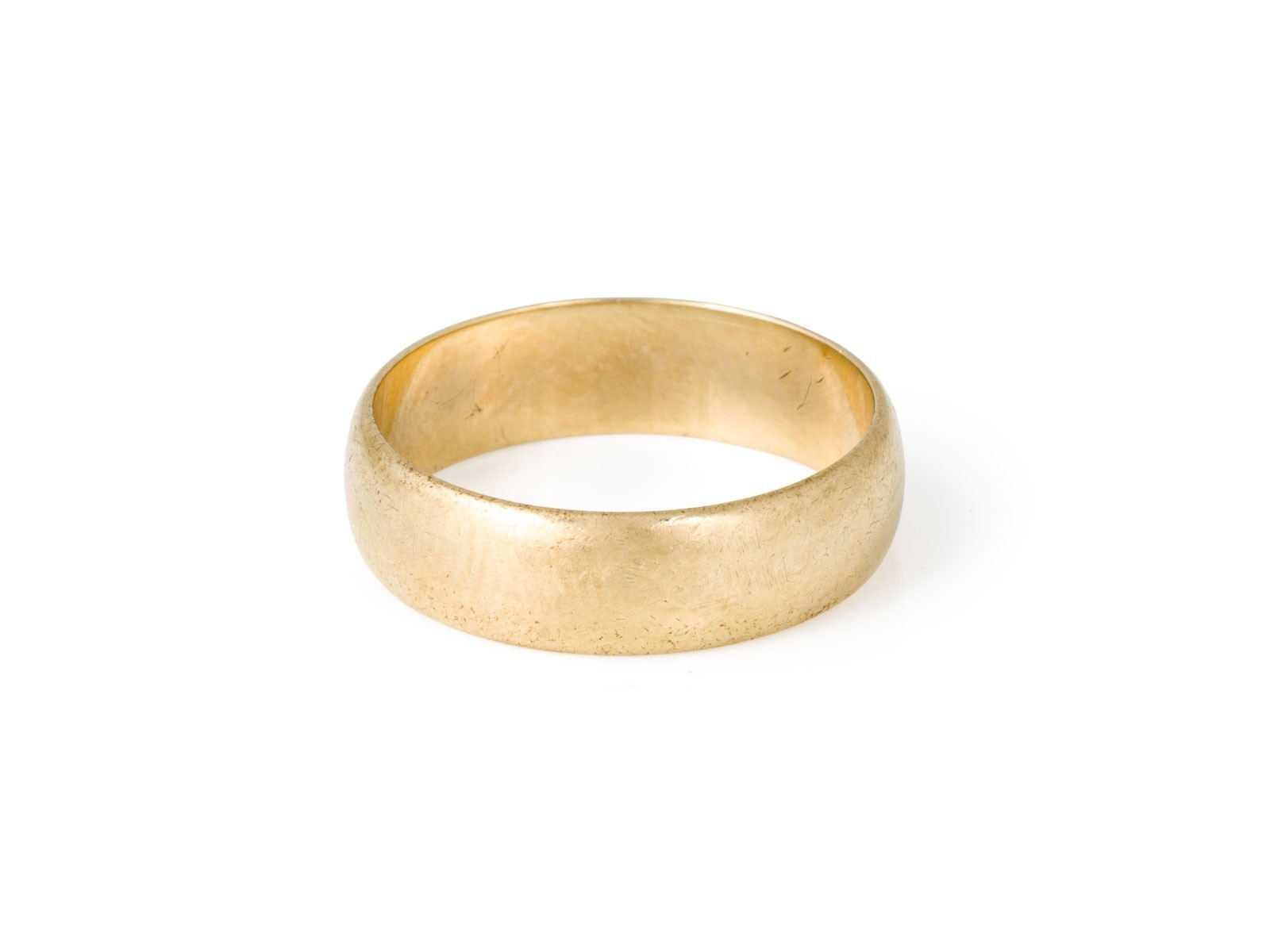 GG 585. Ringmaß: ca. 57. Ringbreite: ca. 5,6 mm. Ges.-Gew.: ca. 4,3 g. Schlichter Bandring/Ehering ohne Besatz.