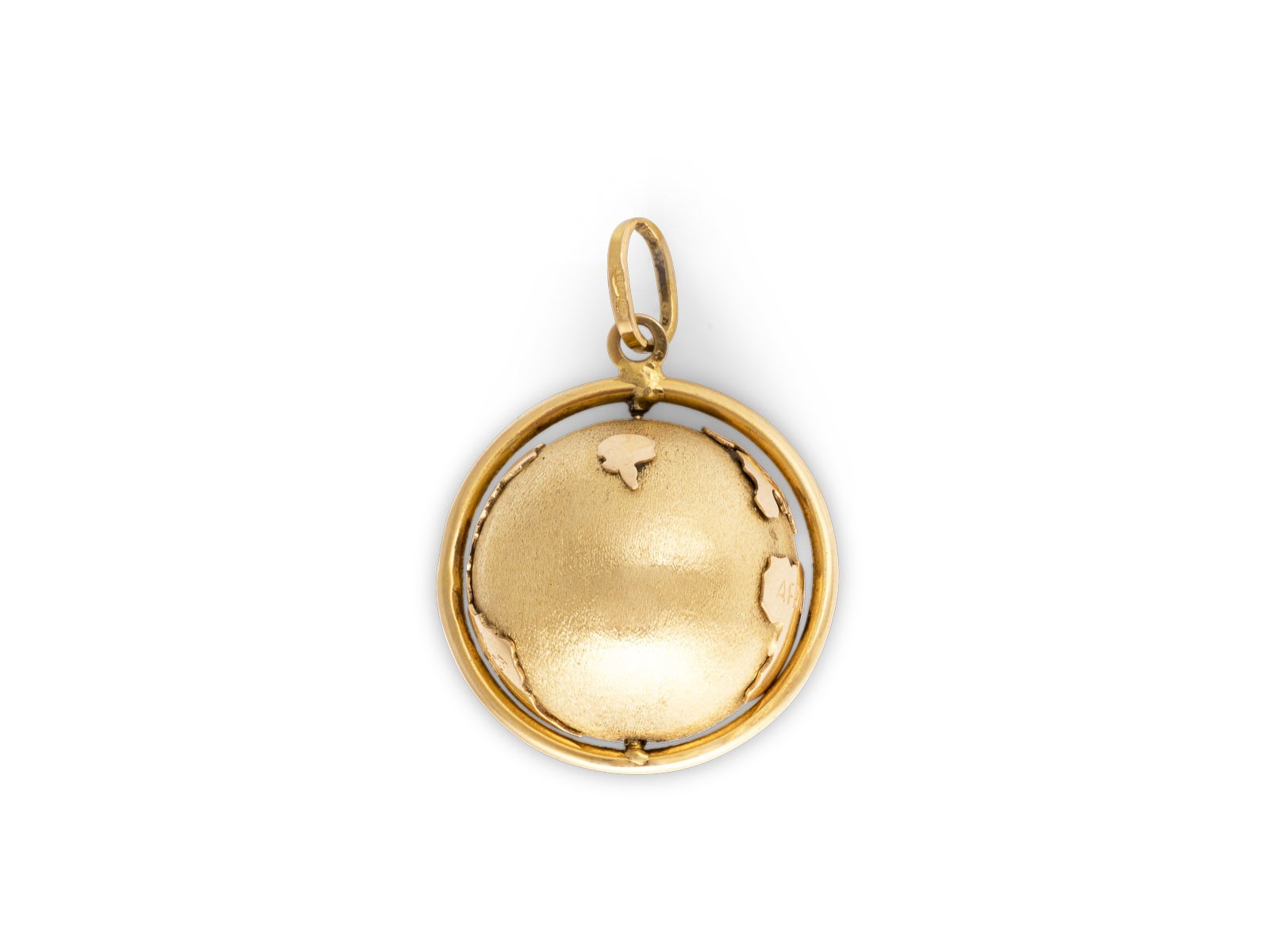GG 750. Maße: L.(inkl. Öse): 42,0 mm, B.: ca. 29,2 mm. Ges.-Gew.: ca. 13,6 g. Drehbarer Weltkugel Anhänger mit eingravierten Kontinenten.
