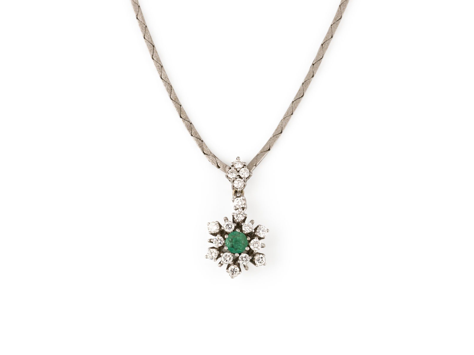 WG 585. L.: ca. 41,5 cm. Ges.-Gew.: ca. 11,8 g. Collier, besetzt mit einem zentralen Smaragd und ca. 17 Brillanten zus. ca. 0.51 ct.