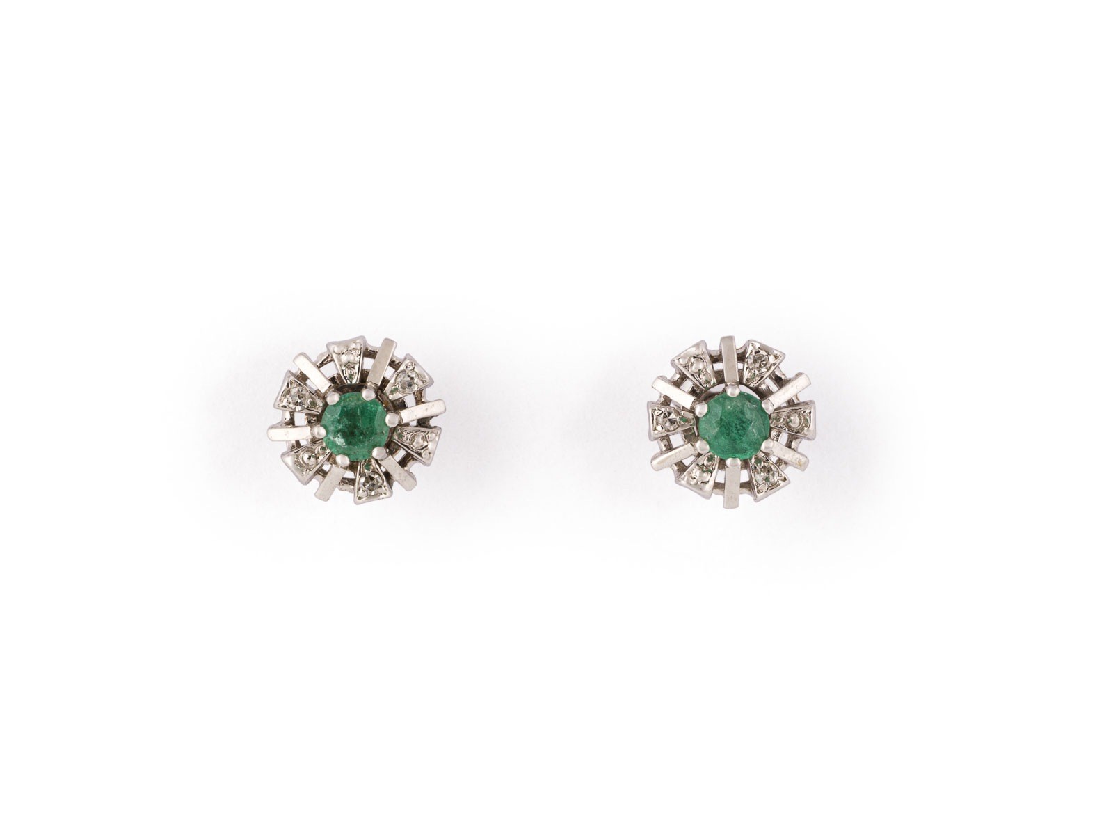 WG 585. D.: ca. 10,6 mm. Ges.-Gew.: ca. 2,8 g. Ohrstecker, besetzt mit jeweils einem zentralen Smaragd á ca. 0.20 ct., sowie Diamanten im