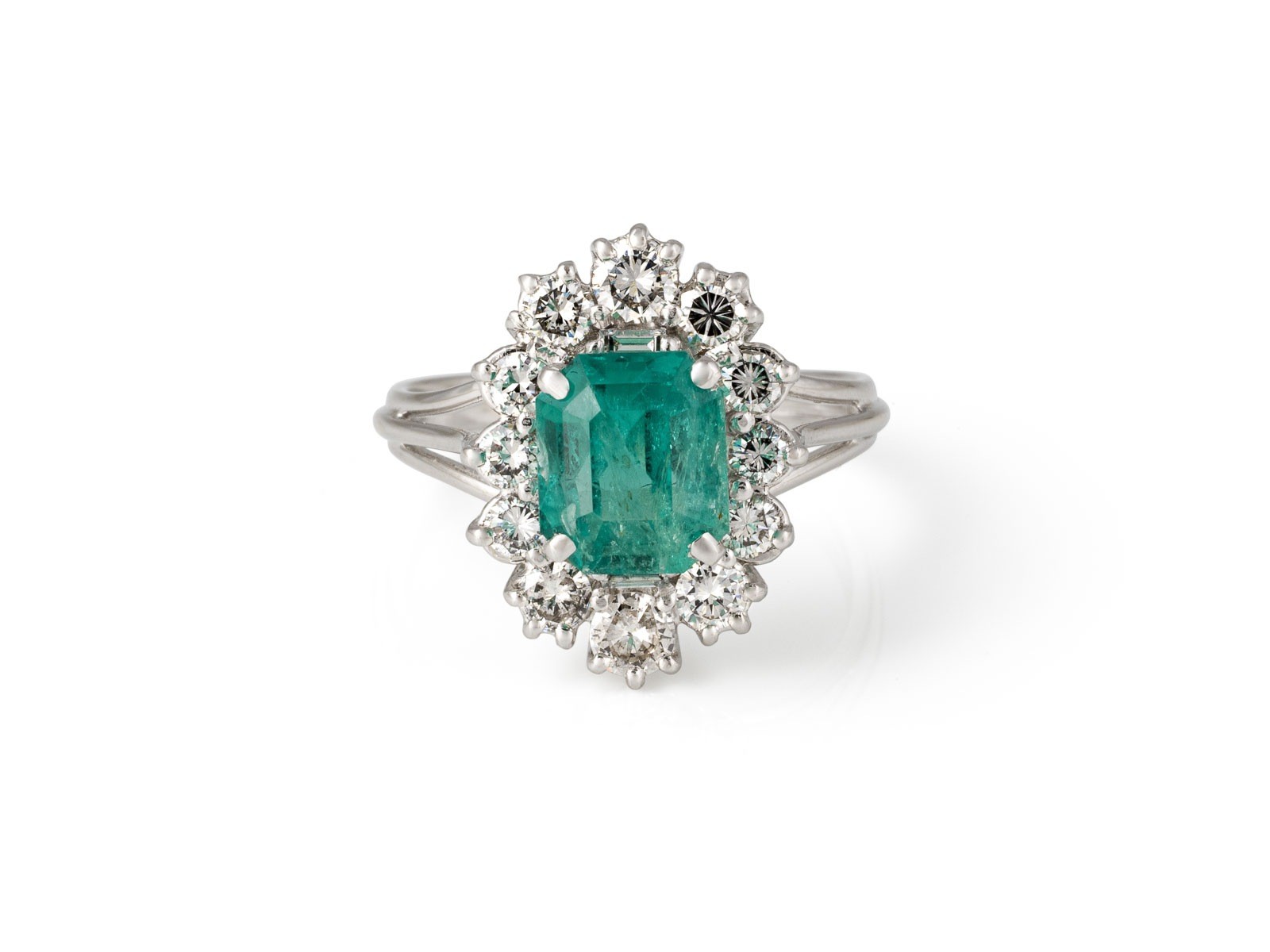 WG 750. Ringmaß: ca. 54. Ringkopfmaße: ca. 17,9 mm x 13,3. Ges.-Gew.: ca. 5,1 g. Ring mit einem zentralen Smaragd von ca. 2.50 ct. und einem Kranz aus Brillanten zus. ca.
