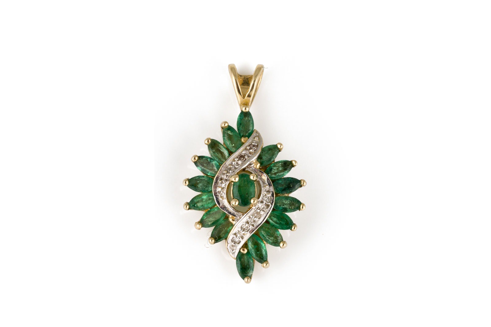 WG/GG 585. Maße: ca. 27,5 x 15,5 mm. Ges.-Gew.: ca. 2,9 g. Anhänger, besetzt mit Smaragden zus. ca. 0.85 ct., sowie kleine Diamanten im 8/8-Schliff.