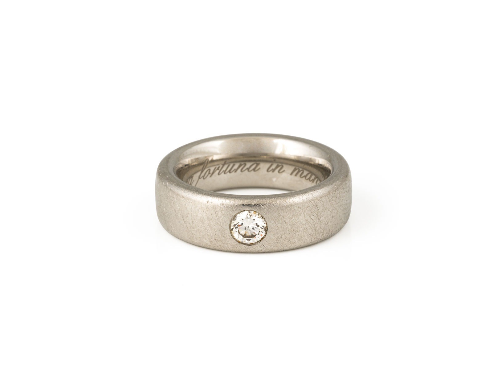 PT 950. Ringmaß: ca. 55. Ringbreite: ca. 7,0 mm. Ges.-Gew.: ca. 24,3 g. Ring, besetzt mit einem zentralen Brillanten von ca. 0.30 ct. D/IF. Innengravur vorhanden.