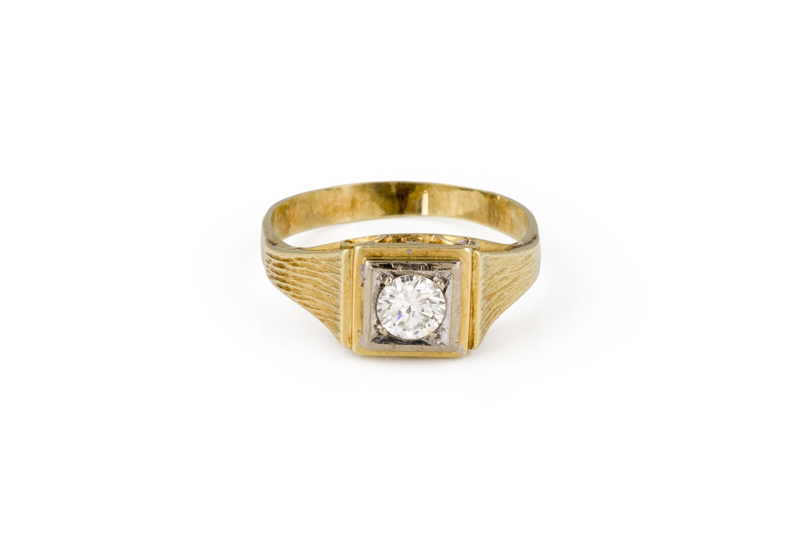 GG 585. Ringmaß: ca. 58. Ringbreite: ca. 8,3 mm. Ges.-Gew.: ca. 3,9 g. Siegelring, besetzt mit einem Brillanten von ca. 0.39 ct. G/VS.