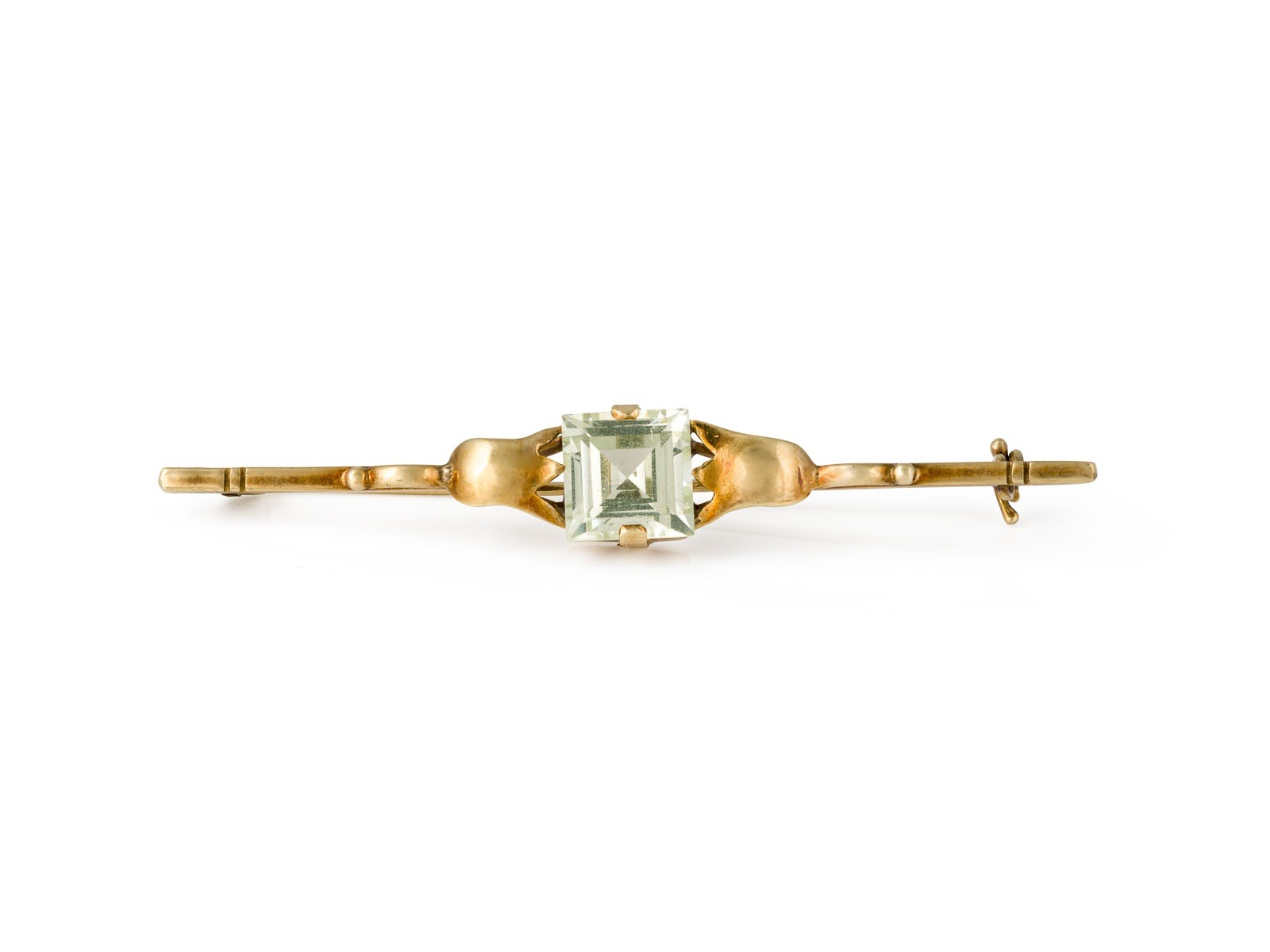 GG 585 (getestet). Maße: ca. 58,2 mm x 8,8 mm. Ges.-Gew.: ca. 3,8 g. Stabbrosche, besetzt mit einem zentralen, hellgrünen Farbstein - wohl Spinell.