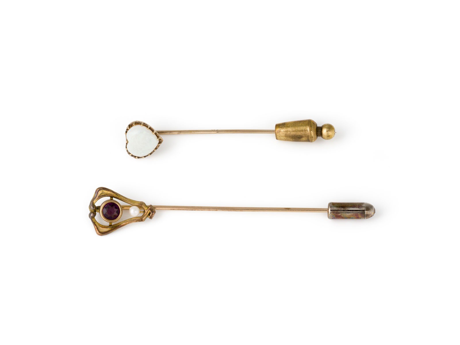 1 x Stecknadel mit einem weißen Herz-Cabochon. GG mind. 333 (getestet). ca. 2,1 g. L.: ca. 50,3 mm. Endkappe aus unedlem Metall.