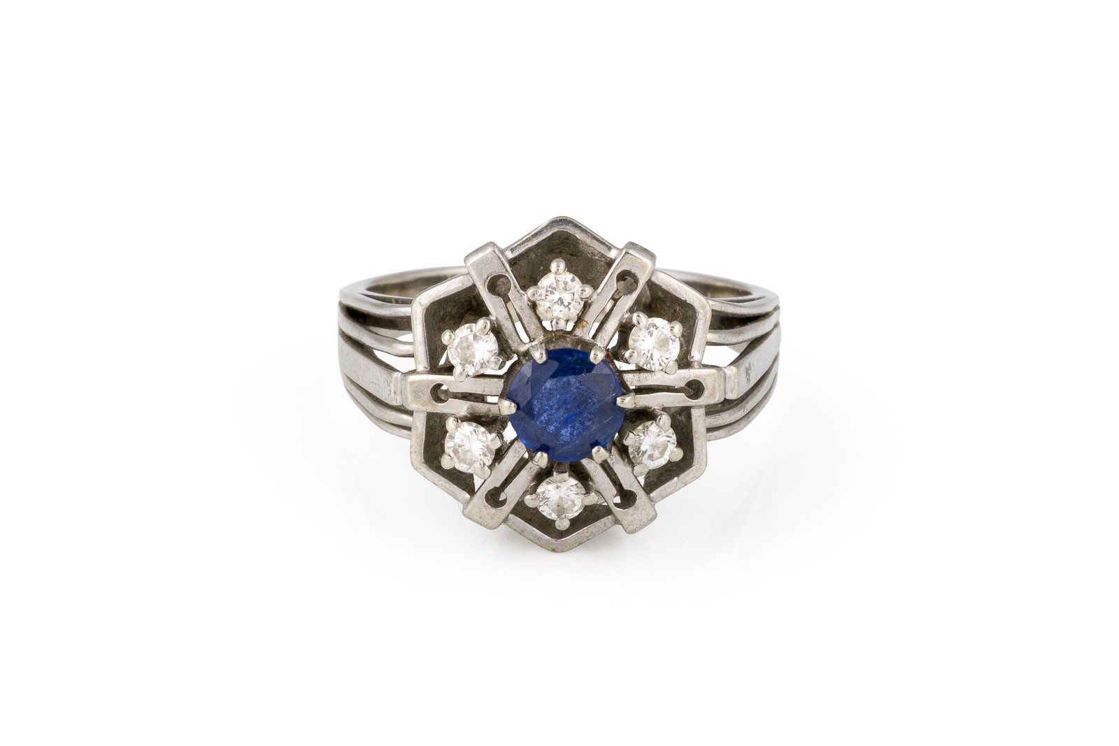 WG 750. Ringmaß: ca. 59. D.(Ringkopf): ca. 16,0 mm. Ges.-Gew.: ca. 8,0 g. Ring mit sternförmigen Ringkopf, besetzt mit einem zentralen Saphir von ca. 0.70 ct. und