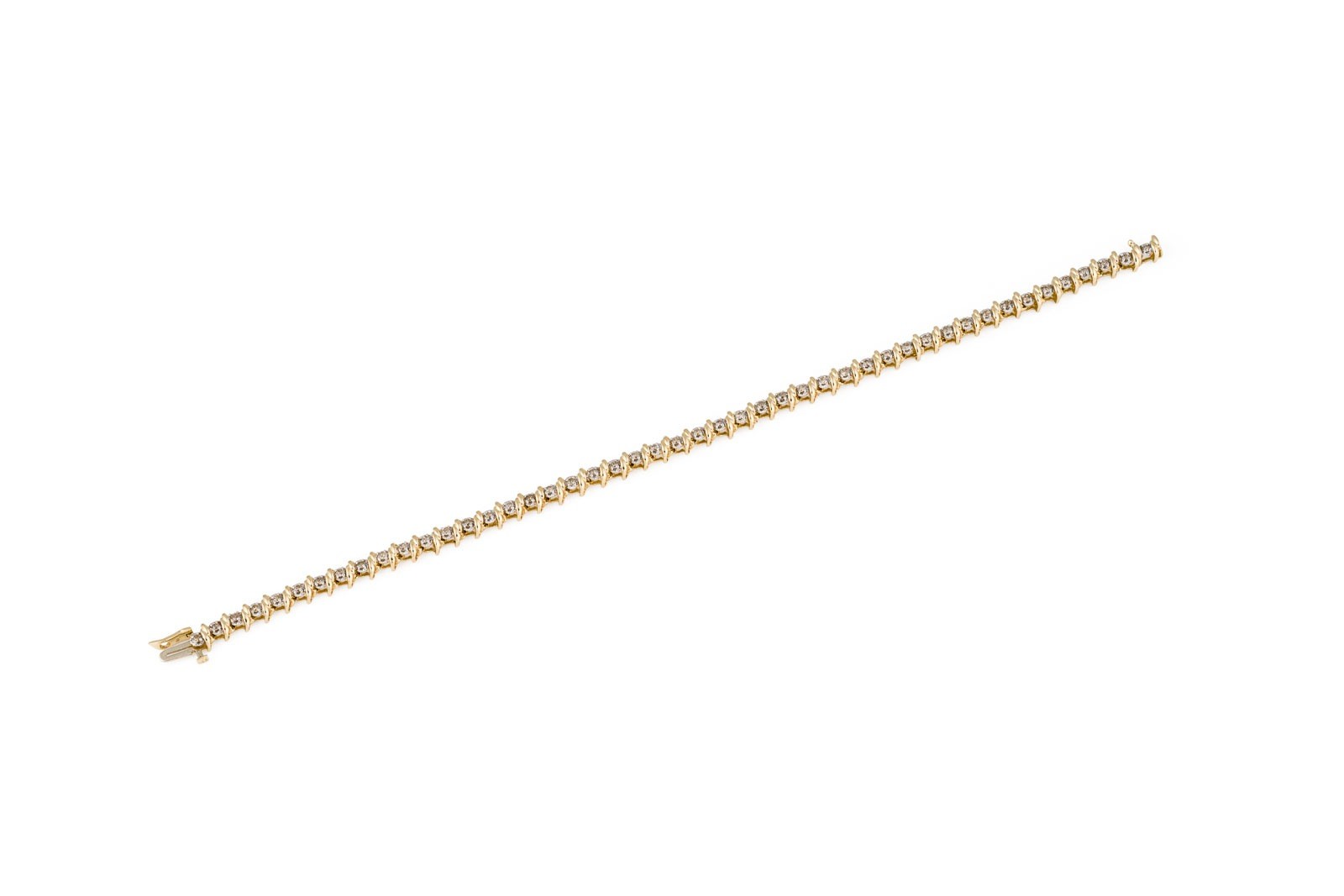 GG 585. L.: ca. 19,5 cm. B.: ca. 5,2 mm. Ges.-Gew.: ca. 8,7 g. Tennisarmband, besetzt mit Brillanten zus. ca. 0.75 ct. Kastenschloss mit Sicherheitsacht.