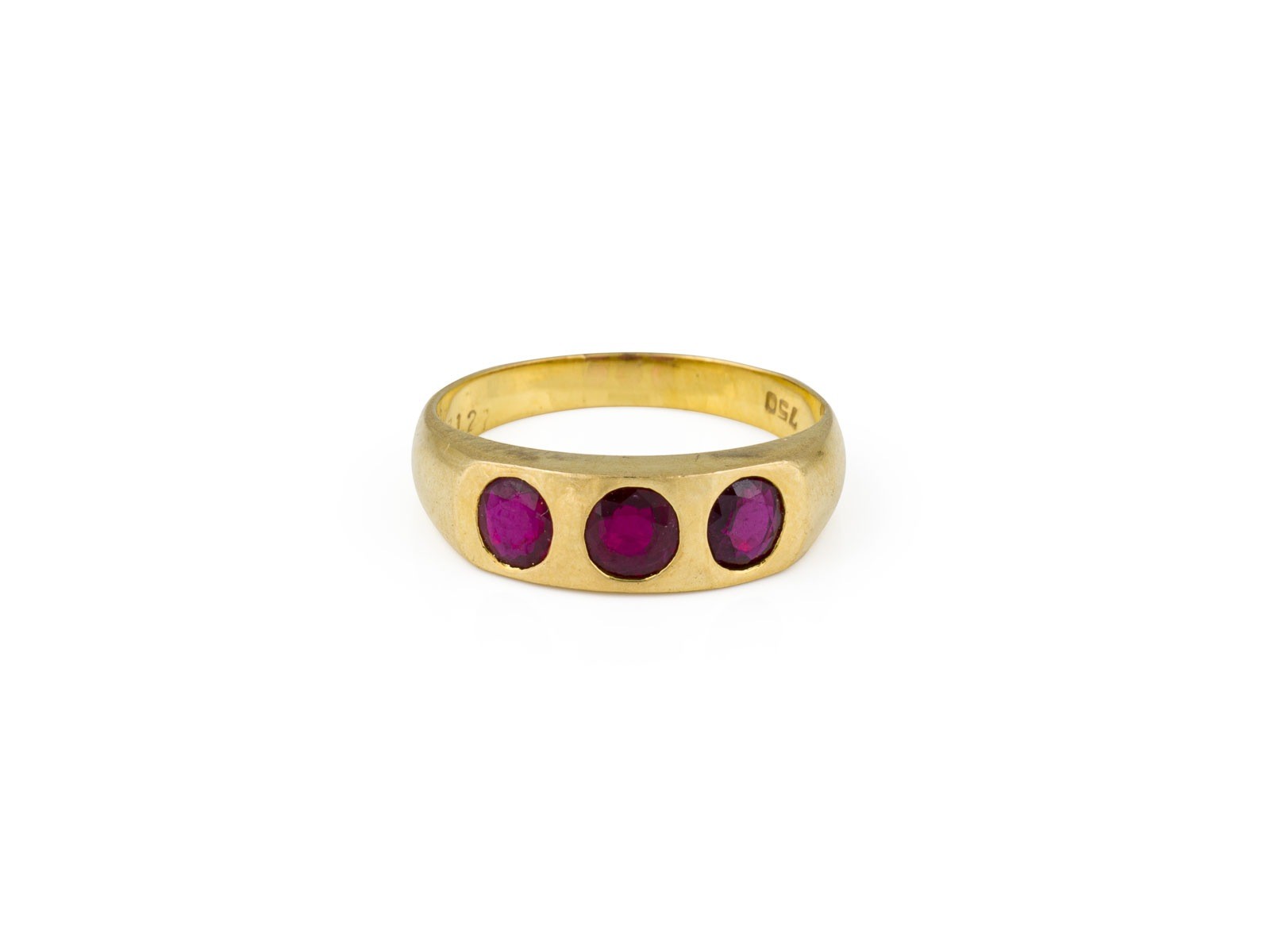 GG 750. Ringmaß: ca. 58. Ringbreite: ca. 6,2 mm. Ges.-Gew.: ca. 4,6 g. Ring, besetzt mit drei Rubinen zus. ca. 1.20 ct.