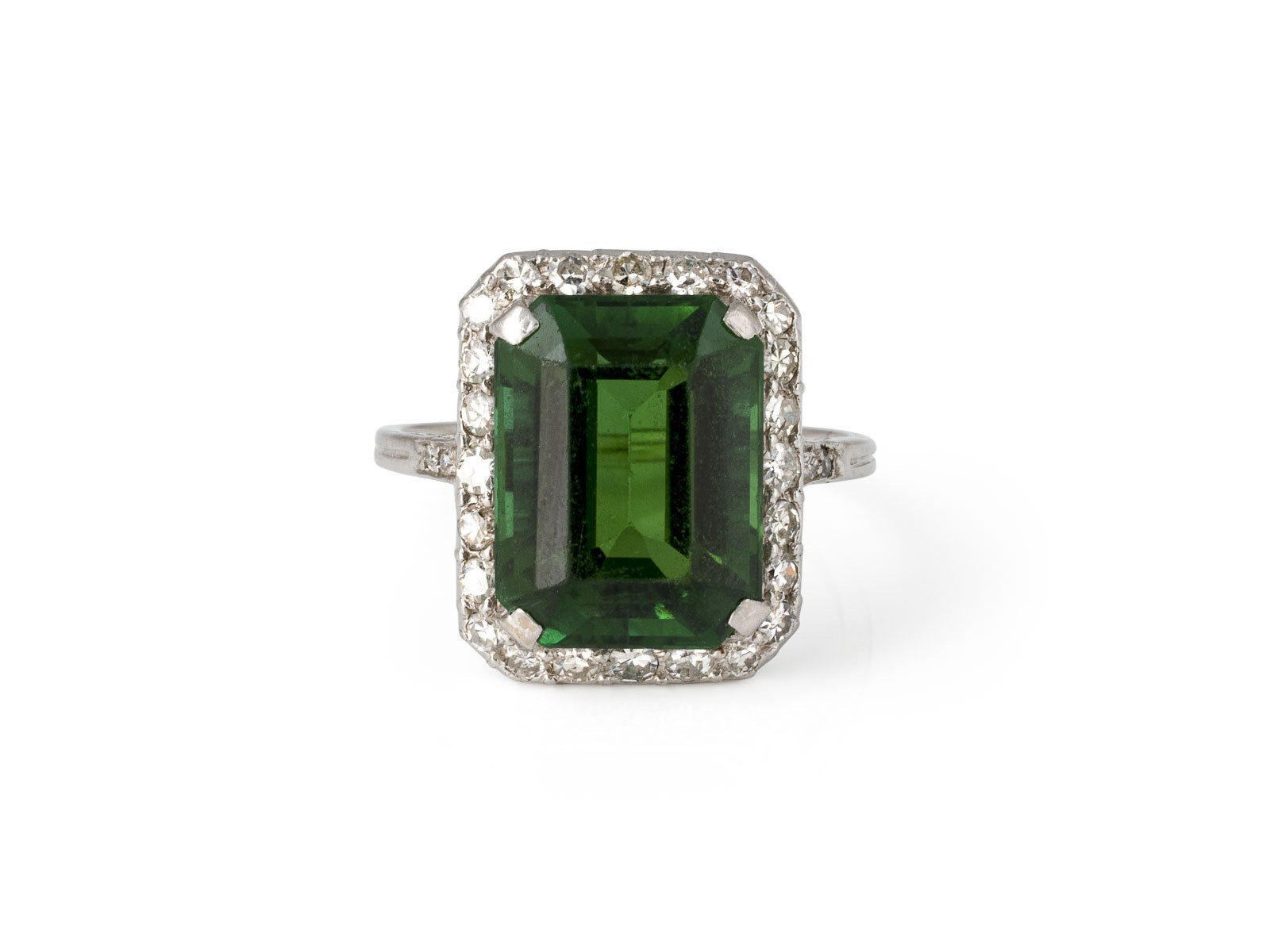 WG 750. Ringmaß: ca. 47. Ringkopfmaße: ca. 15,3 mm x 12,3. Ges.-Gew.: ca. 4,0 g. Ring mit einem zentralen rechteckig facettierten Turmalin von ca. 5.50 ct. und einem Kranz