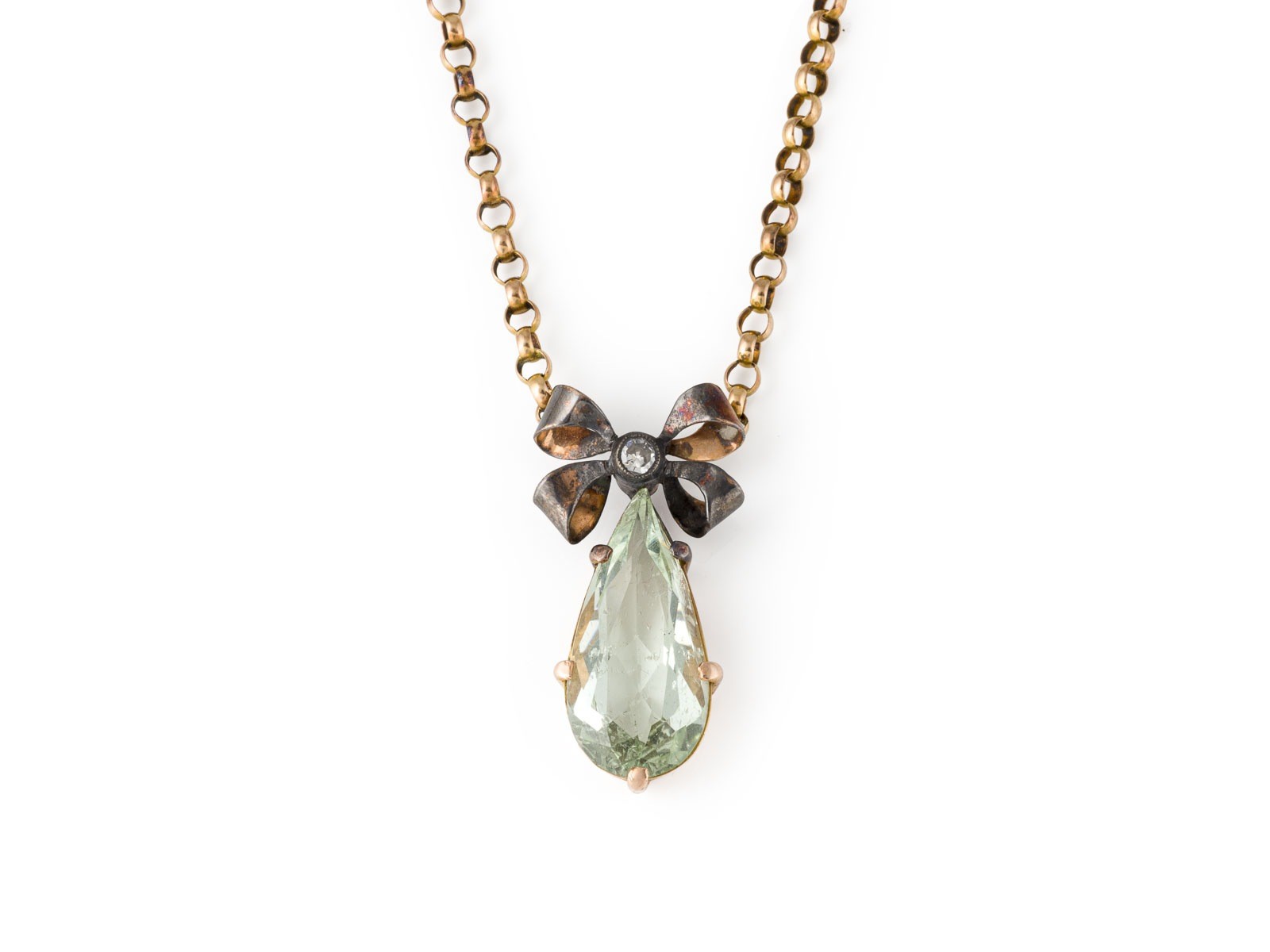RG 585. Maße: L.(Kette): ca. 43,0 cm. Anhänger: ca. 28,7 m. Ges.-Gew.: ca. 8,3 g. Collier mit einem fest angebrachten Schleifenanhänger, besetzt mit einem kleinen Diamanten