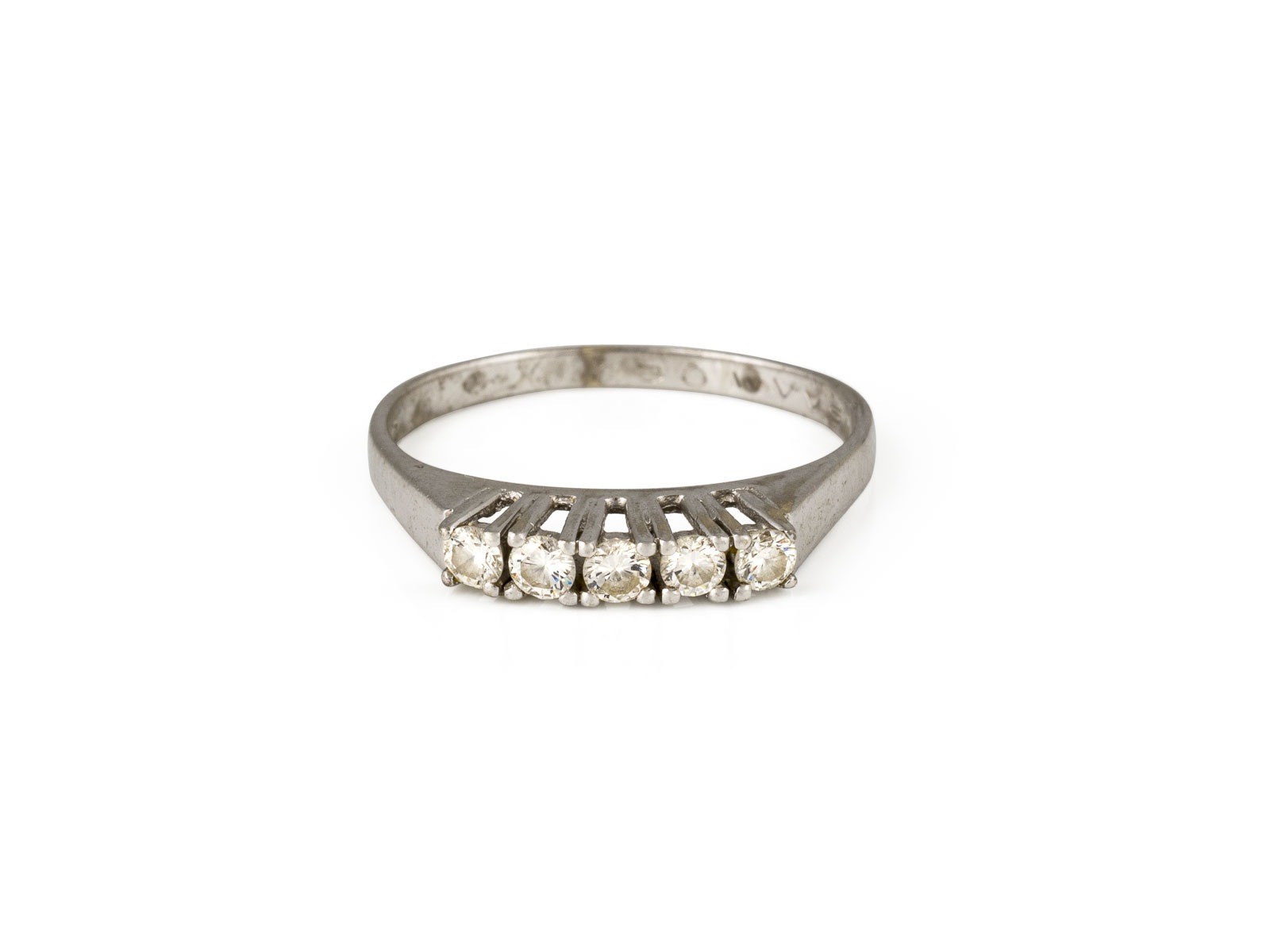 WG 585. Ringmaß: ca. 55. Ringbreite: ca. 3,0 mm. Ges.-Gew.: ca. 2,2 g. Ring, besetzt mit 5 Brillanten zus. ca. 0.30 ct. H/VVS.