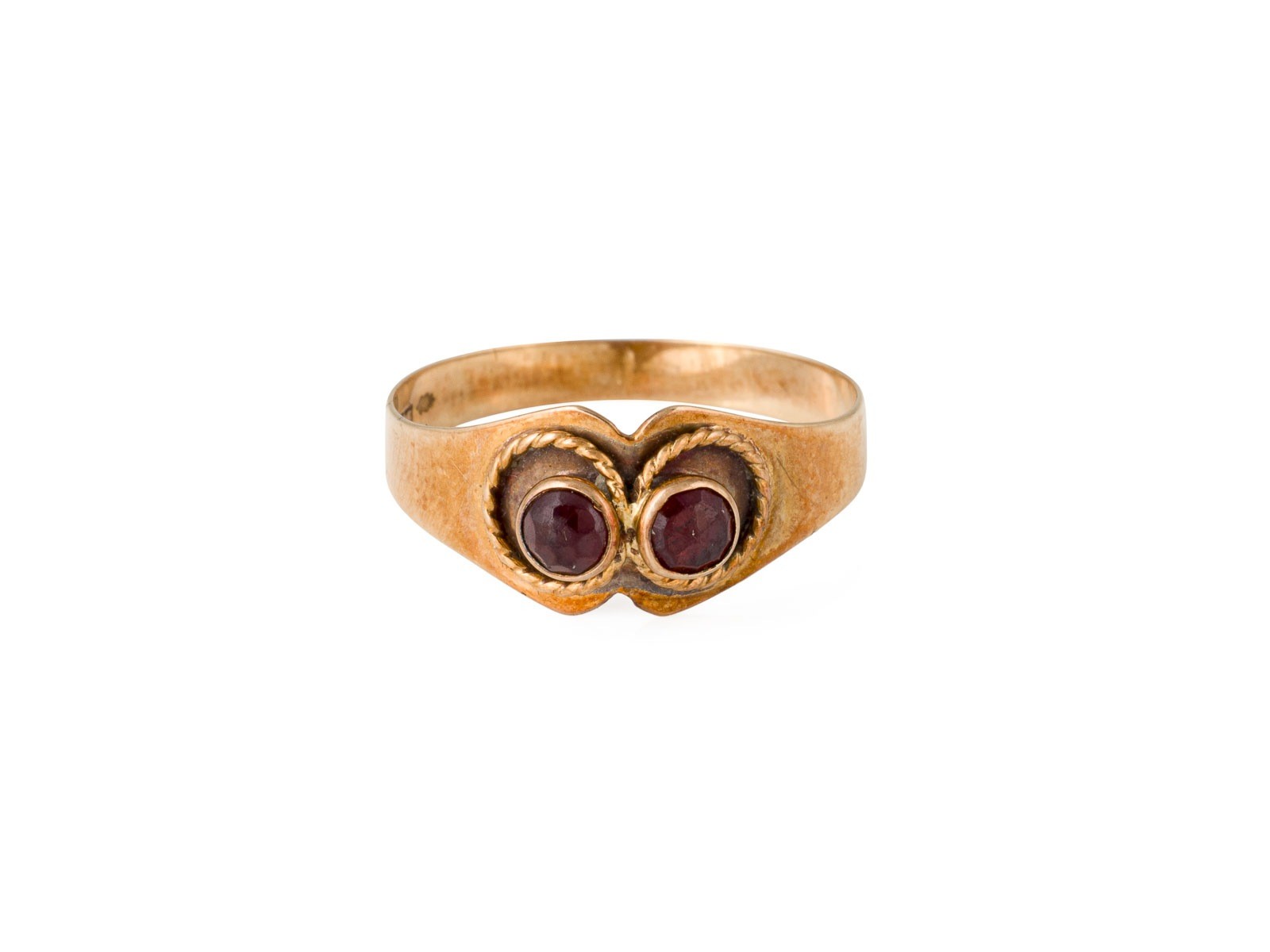 RG 585 (getestet). Ringmaß: ca. 54. Ringbreite: ca. 8,3 mm. Ges.-Gew.: ca. 1,5 g. Alter, zarter Ring mit 2 kleinen roten Farbsteinen.