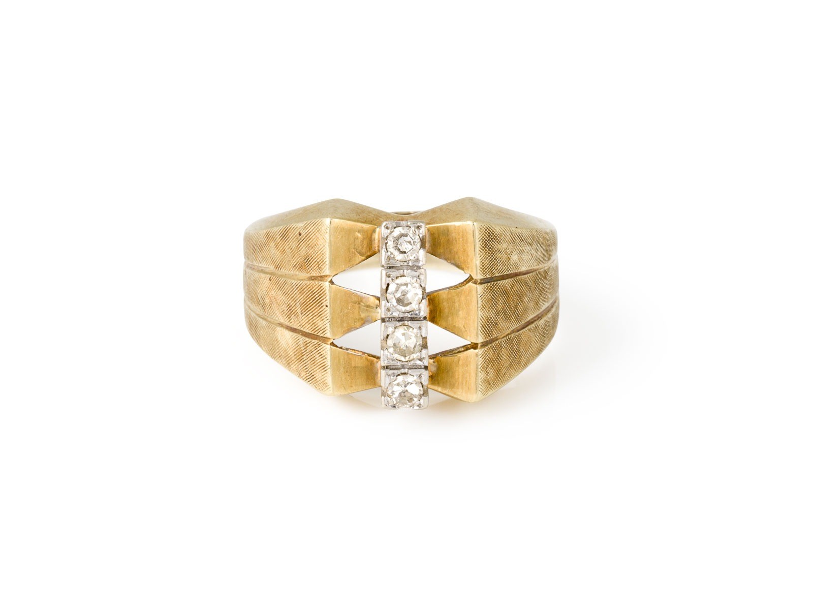 GG 585. Ringmaß: ca. 57. Ringbreite: ca. 12,6 mm. Ges.-Gew.: ca. 7,1 g. Ring besetzt mit 4 Diamanten im 8/8-Schliff zus. ca. 0.20 ct. I-L/SI-P.