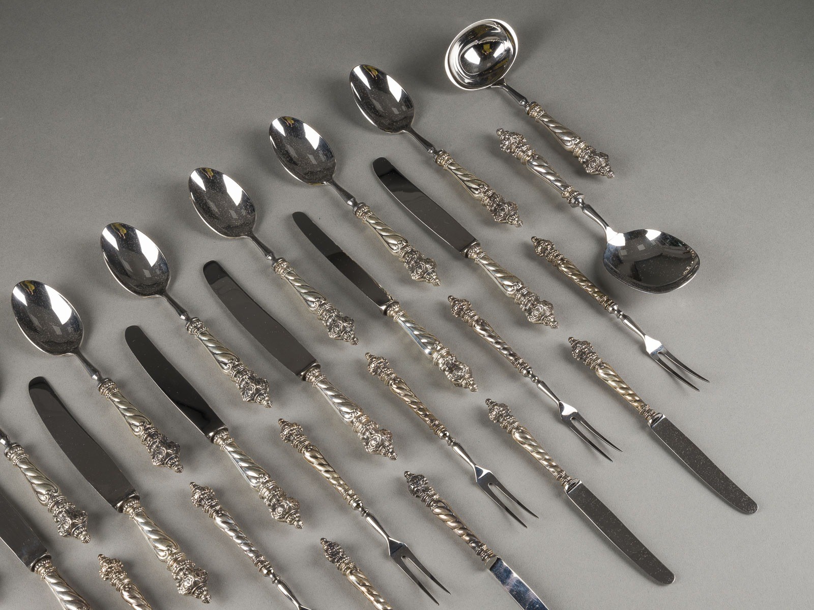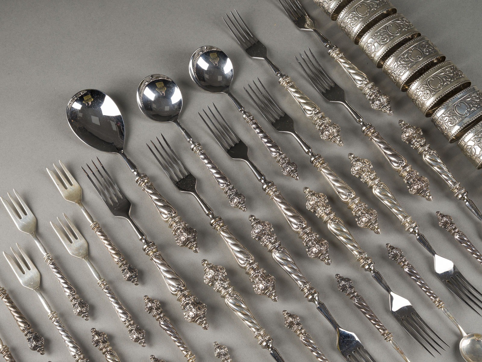 835/925er Silber, Metall. Ges.-Gew. 1051 g (nur Silber). Punziert mit Feingehalt '835'/'925' und 'ALBO'. Bestehend aus: 12 Serviettenringen, 12 Menügabeln, 6 Menülöffeln, 12 Menümessern, 12