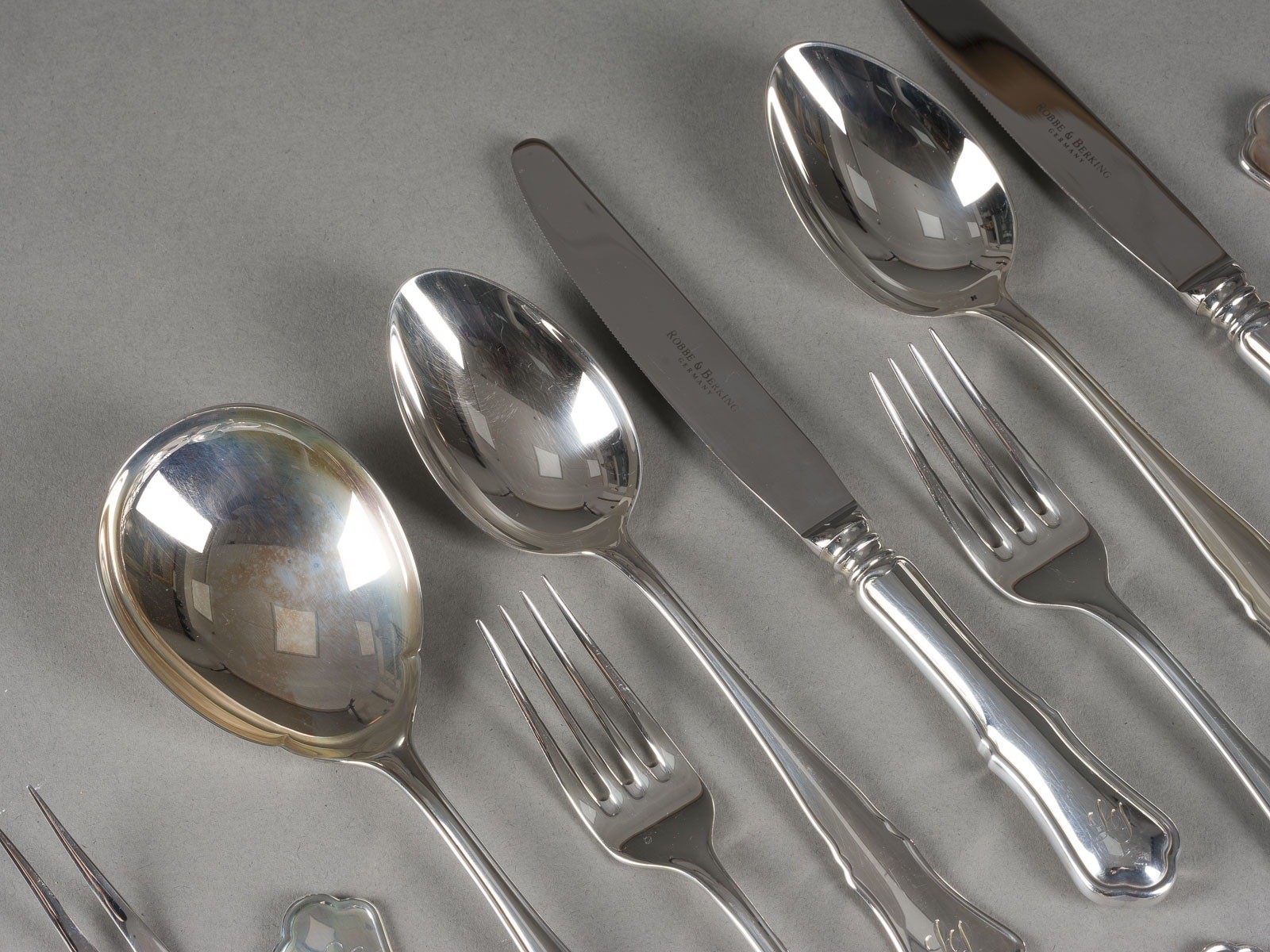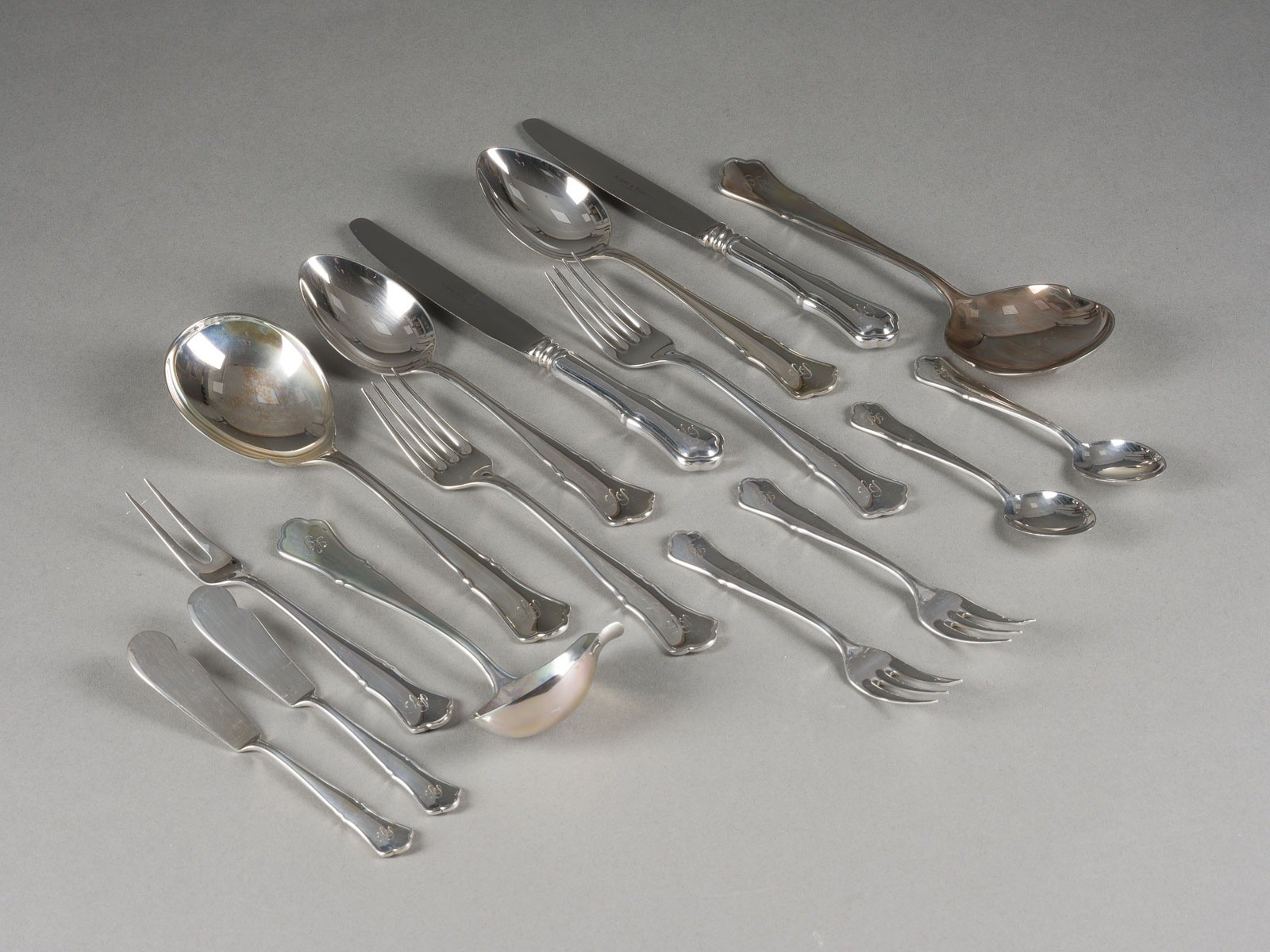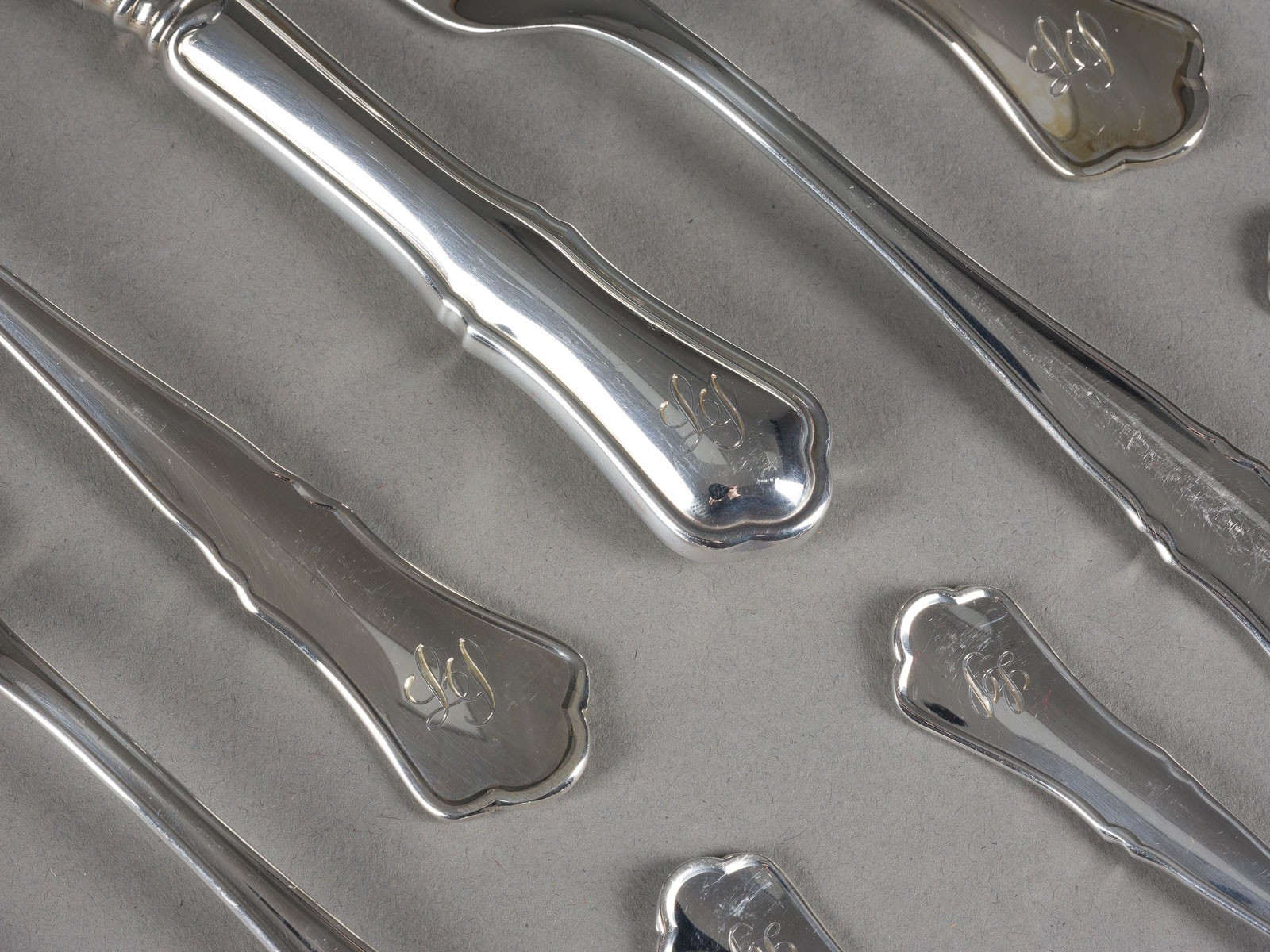 925er Silber. Ges.-Gew. 1622 g (ohne Messer). Punziert mit Halbmond, Krone, Feingehalt '925', Firmensignet. Mit Monogramm. Bestehend aus: 6 Kaffeelöffeln, 6 Menülöffeln, 6 Menümessern, 6 Menügabeln,