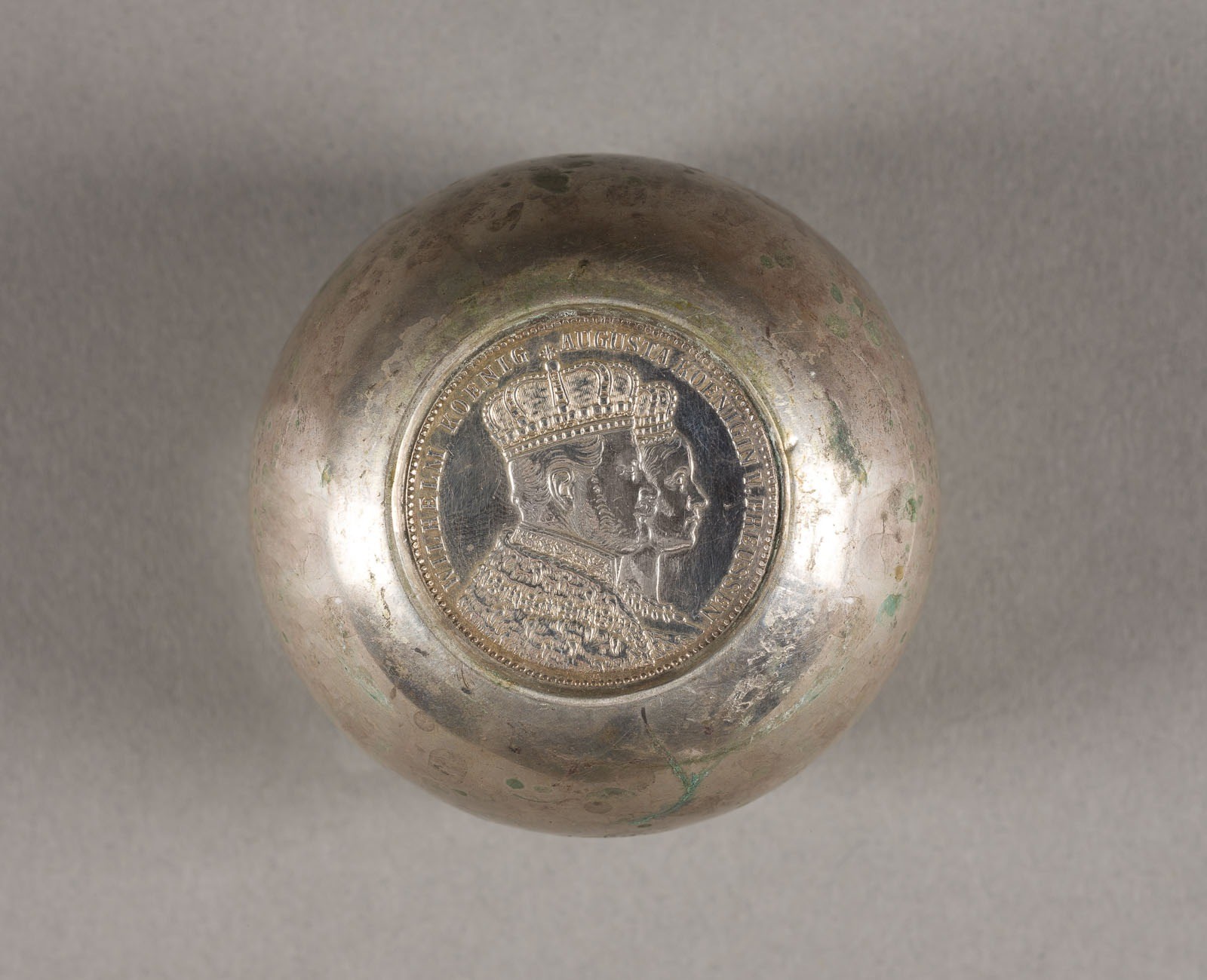 800er Silber. Gew. 104 g, H. 5,7 cm. Punziert mit Halbmond, Krone, Feingehalt '800'. Preußen-Krönungstaler 1861 Wilhelm I., SS. Monogrammiert mit 'BW'. Oberflächenkratzer, Gebrauchsspuren.