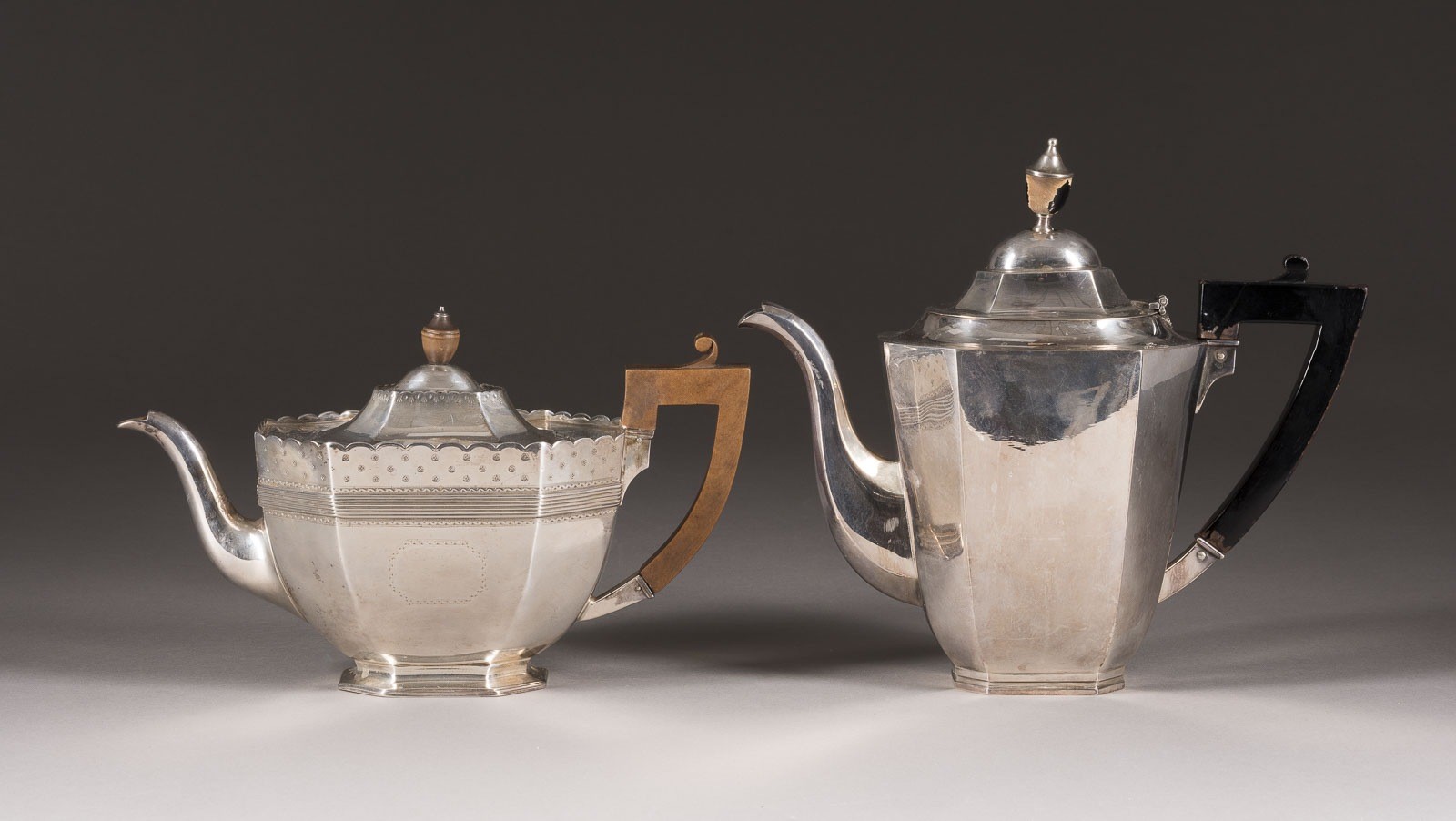 Silber, Holz. Ges.-Gew. 1400 g. Punziert mit Garantiemarken, Herstellermarke sowie Jahresbuchstaben 'G', 'Prata 833' und Herstellermarke (unles.). Knauf min. gebogen.