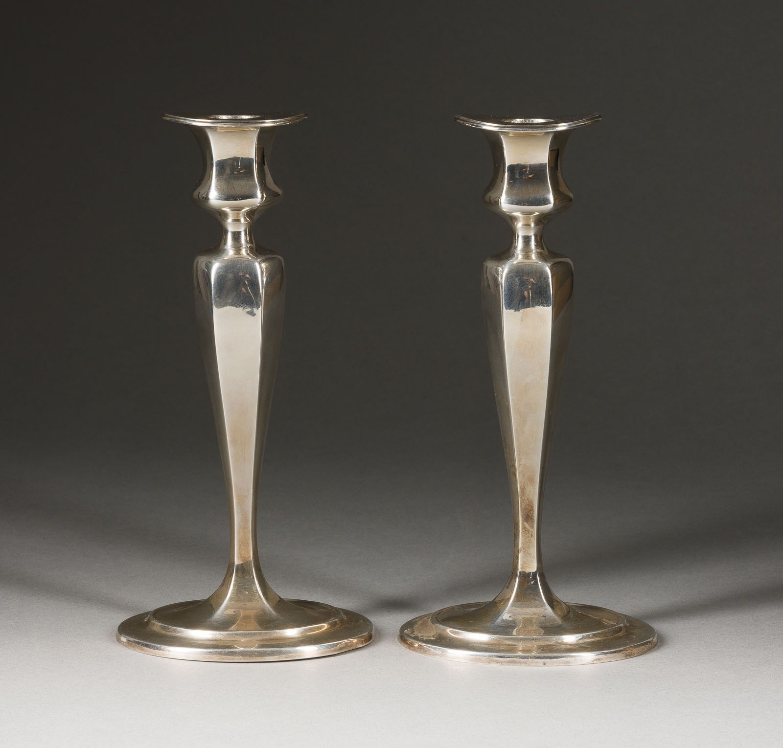 Sterling Silber, gefüllt. Ges. Gew. 876 g, H. 23 cm. Punziert mit Firmensignet 'Tiffany & Co/'17659', 'Makers', '6585', 'Sterling silver', '925-1000' und 'm'. Ein Leuchter min. gebogen.