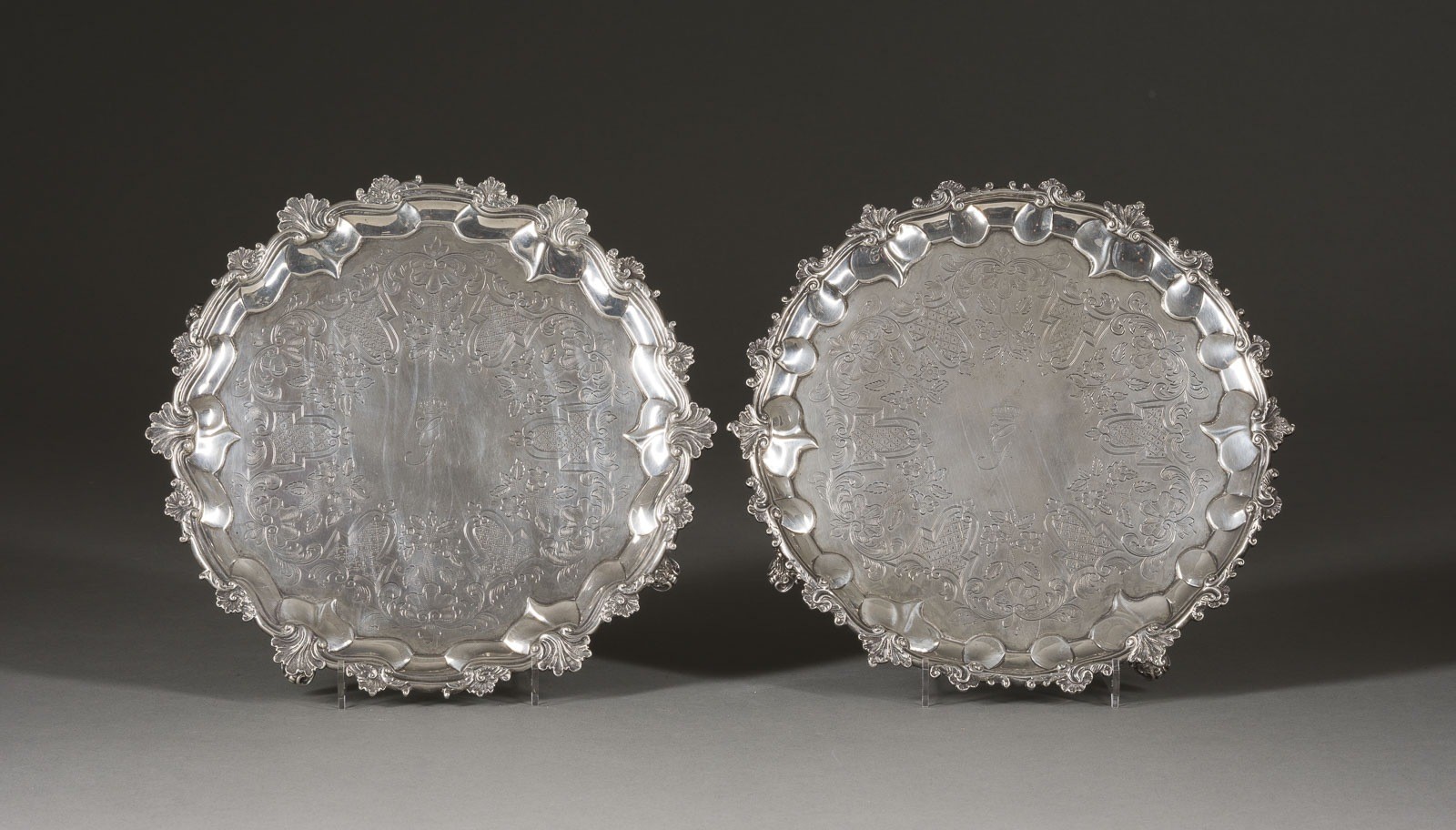 Silber. Ges. Gew. 1087 g, D. 24,5 cm. Punziert mit Garantiemarken, Herstellermarke sowie Jahresbuchstaben 'Q' und 'R', sowie Queen Victoria Punze. Monogramm G unter Krone.