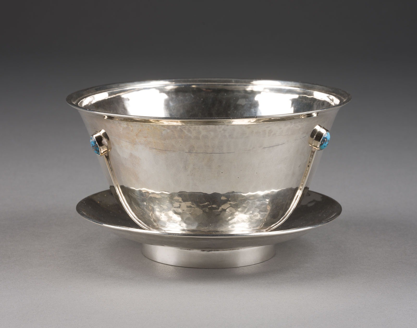 Sterling Silber, Türkissteine. Ges.-H. 7,9 cm, D. 14 cm (Schale), D. 13,2 cm (UT), Ges.-Gew. 339 g. Punziert mit Garantie- und Herstellermarken sowie mit Jahresbuchstabe 'h', Modellnr. '2309'. Min. Oberflächenkratzer.