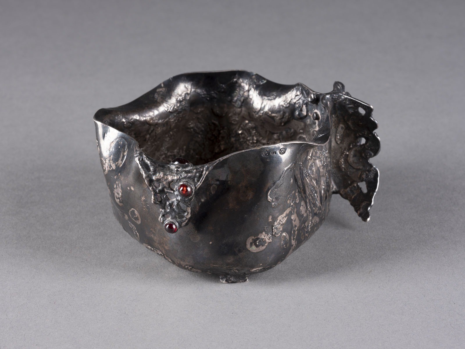835er Silber. Gew. 324 g. Punziert mit Halbmond, Krone, Feingehalt '835' und Firmensignet. Mit drei roten Farbstein-Cabochons besetzt.
