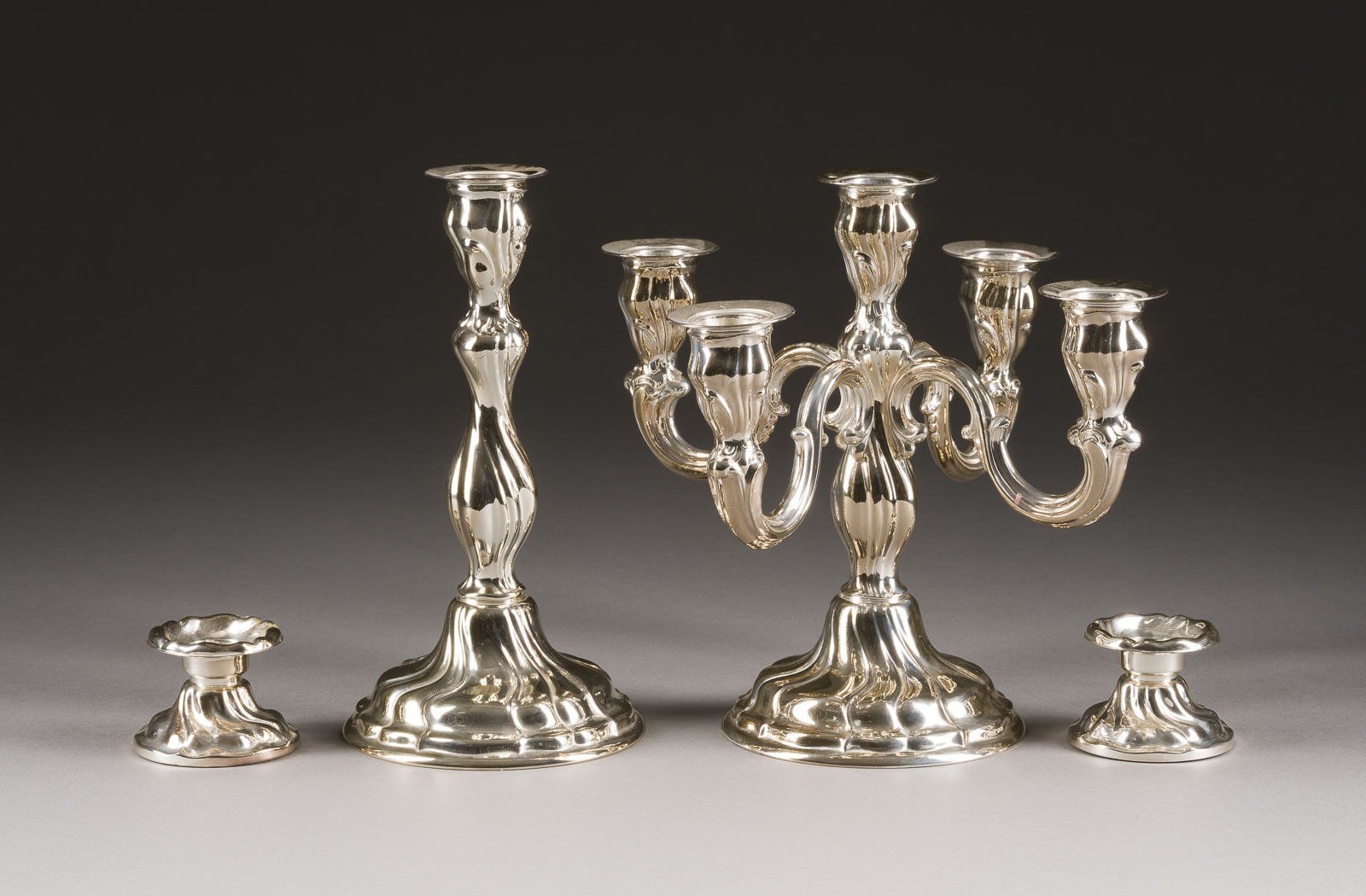 925er Silber, gefüllt. Ges.-Gew. 956 g, H: 4-18,5 cm. Punziert mit Halbmond, Krone, Feingehalt '925' und Firmensignet. Gebrauchsspuren.
