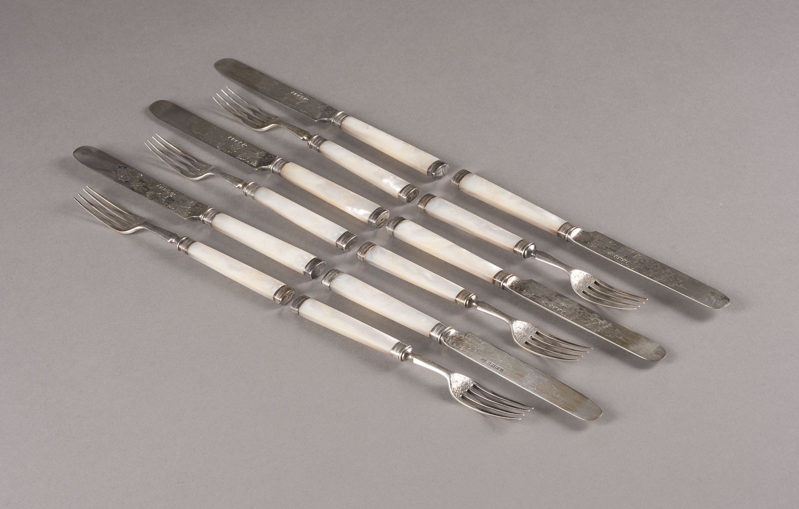 Silber, Perlmutt. Ges. Gew. 922 g, L. 19,5 cm (Messer), L. 16 cm (Ga. Unterseitig punziert mit Feingehaltsmarke, Hersteller- und Garantiemarken sowie Jahresbuchstabe 'm'. Mit Monogramm "AM" und in originaler Holzkiste. Bestehend aus: 12 Messern und 12 Gabeln.